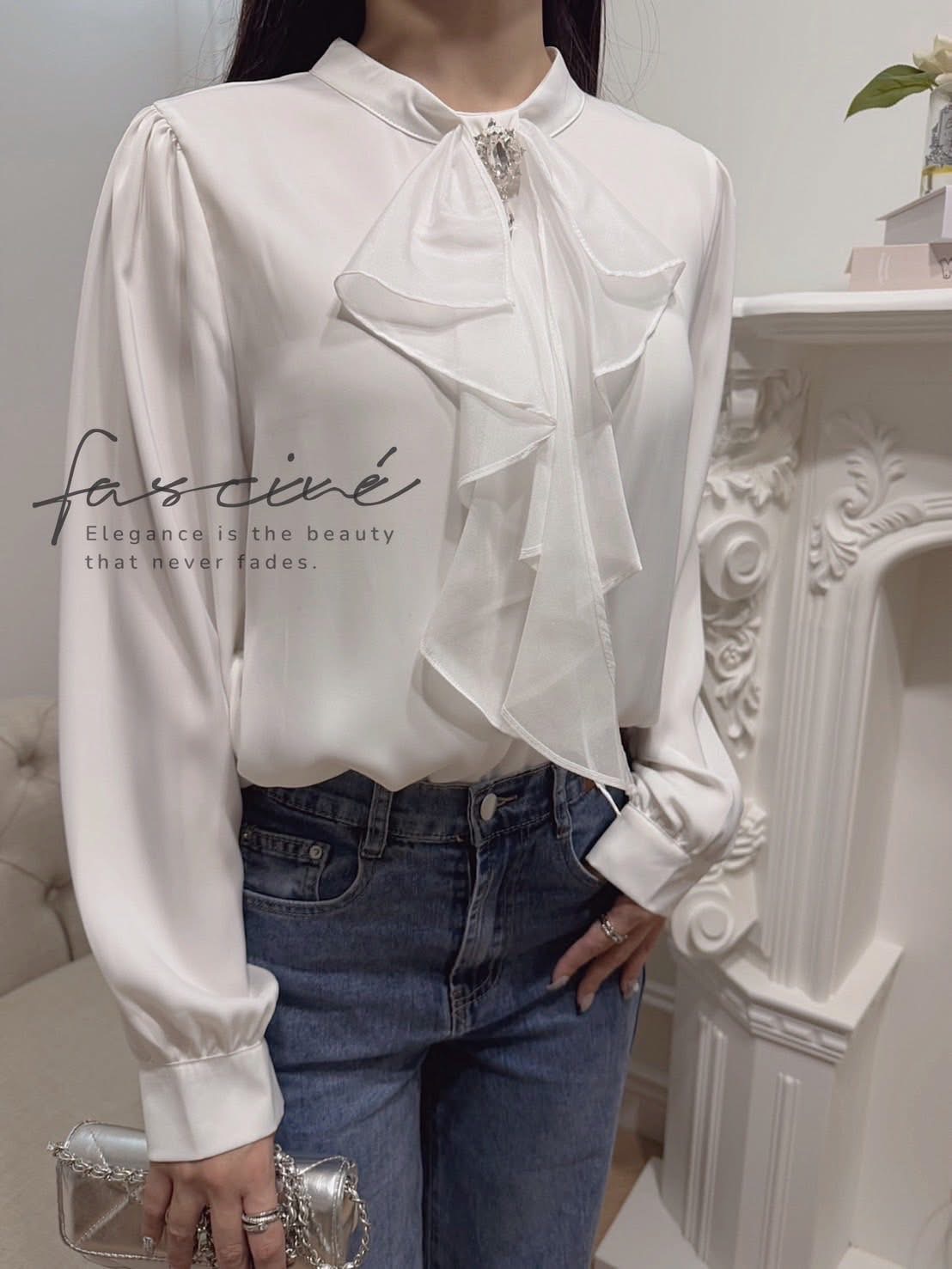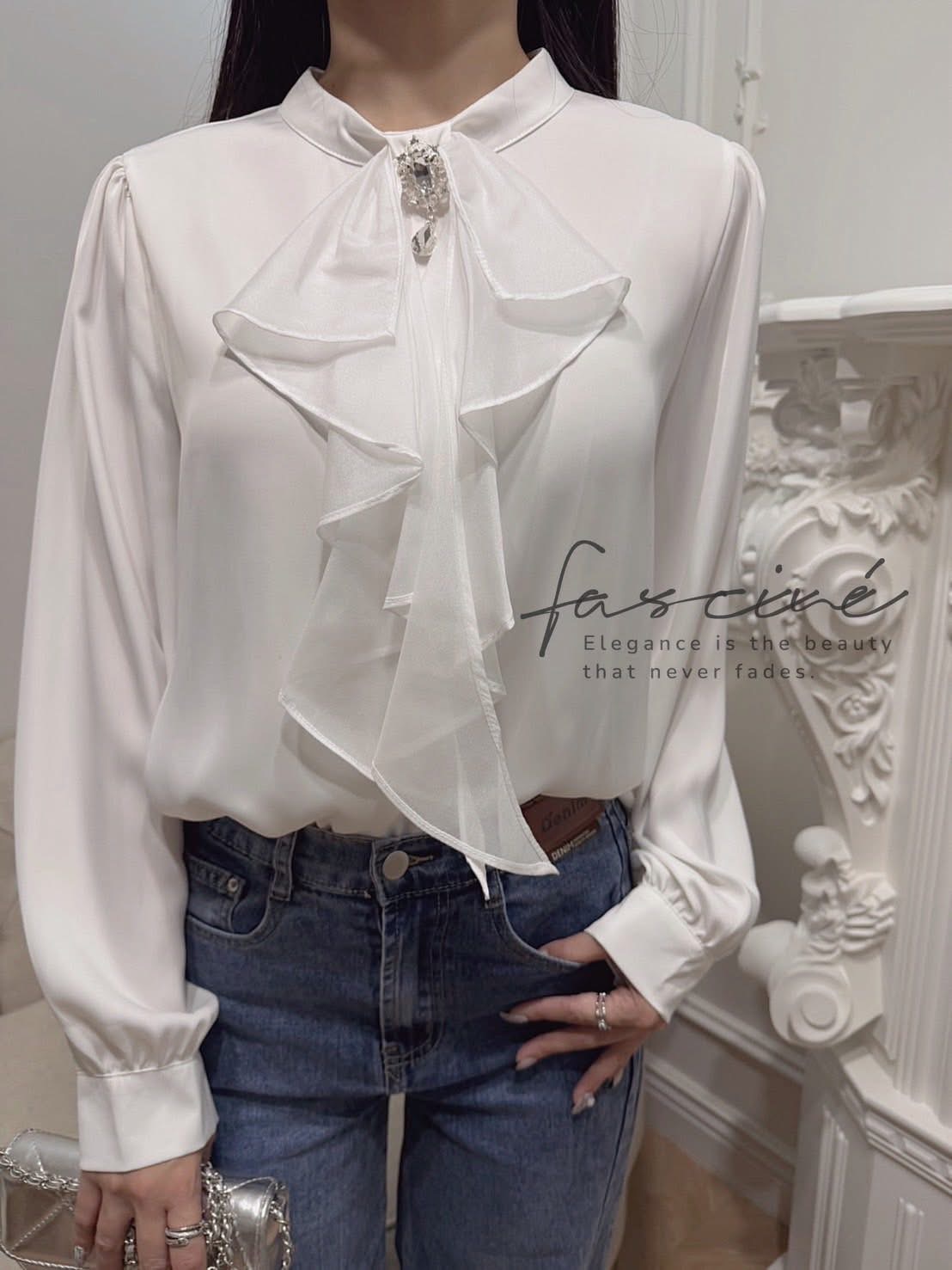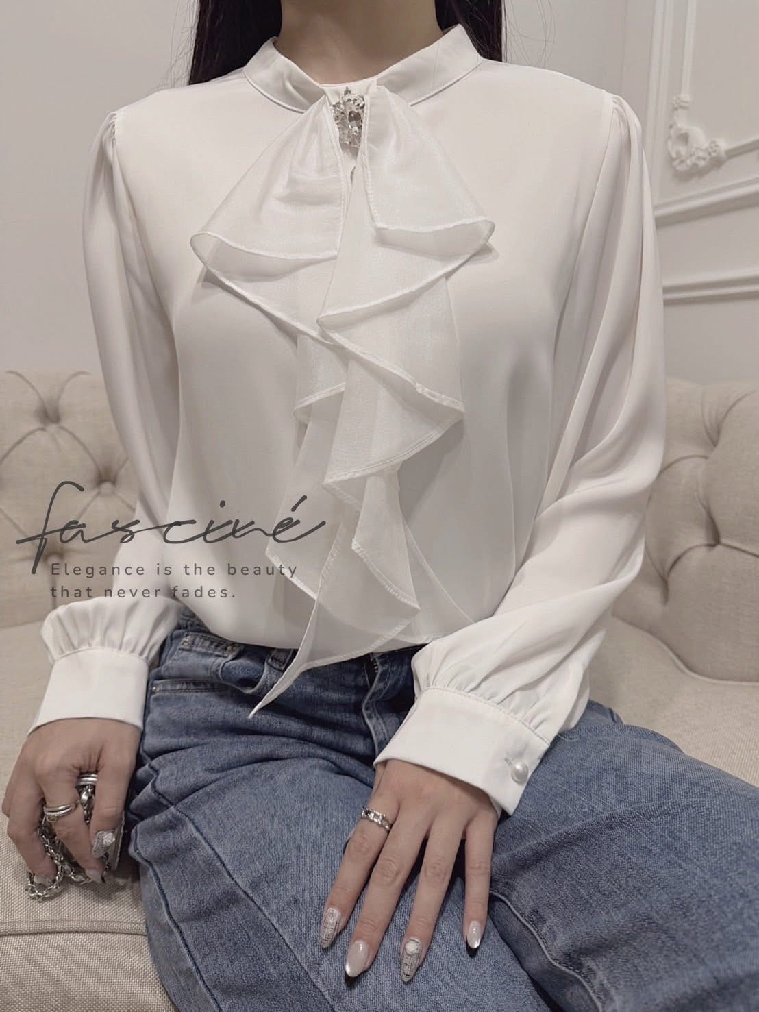 輕盈雪紡帶出微霧光澤,垂墜不貼膚,一穿即有柔和光暈感;立領結構結合層次荷葉,修飾頸肩比例,優雅而俐落;胸前鑽飾低調點睛,通勤、會議到約會皆能自在轉換風格,微寬版型上身更顯修飾。