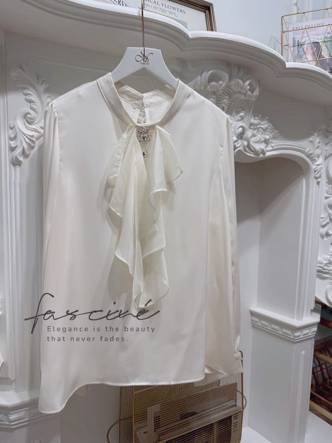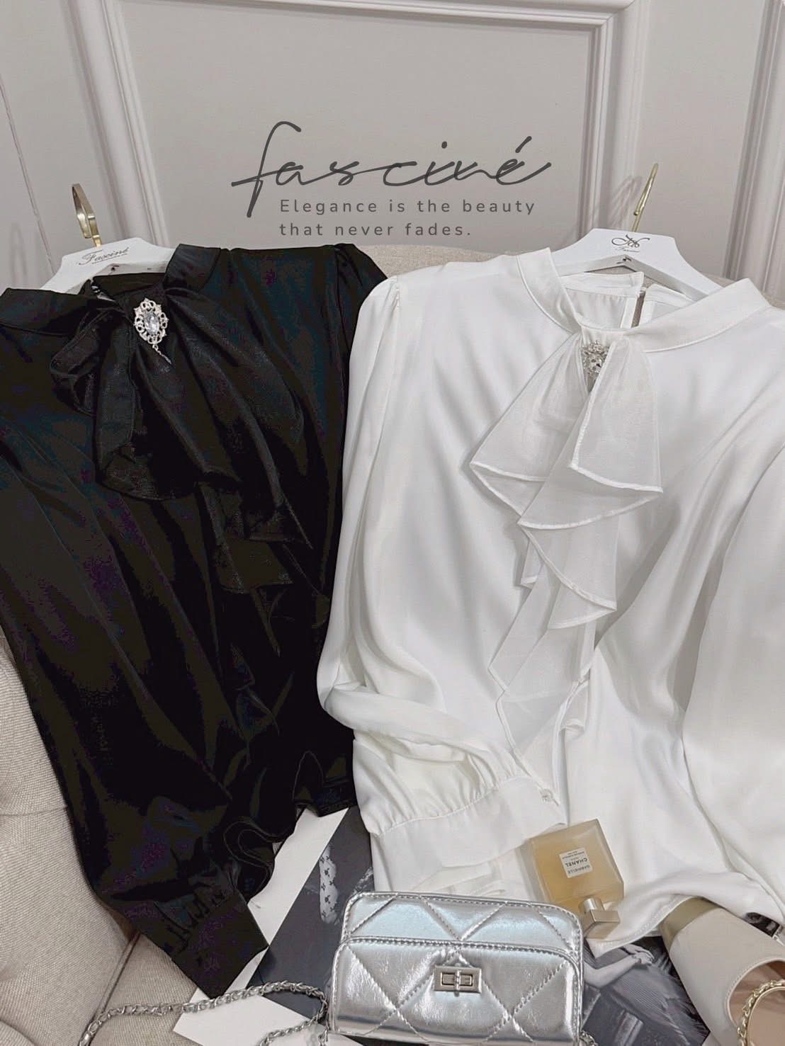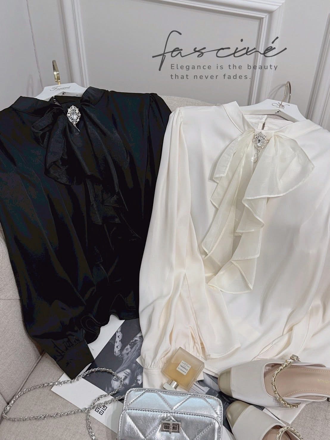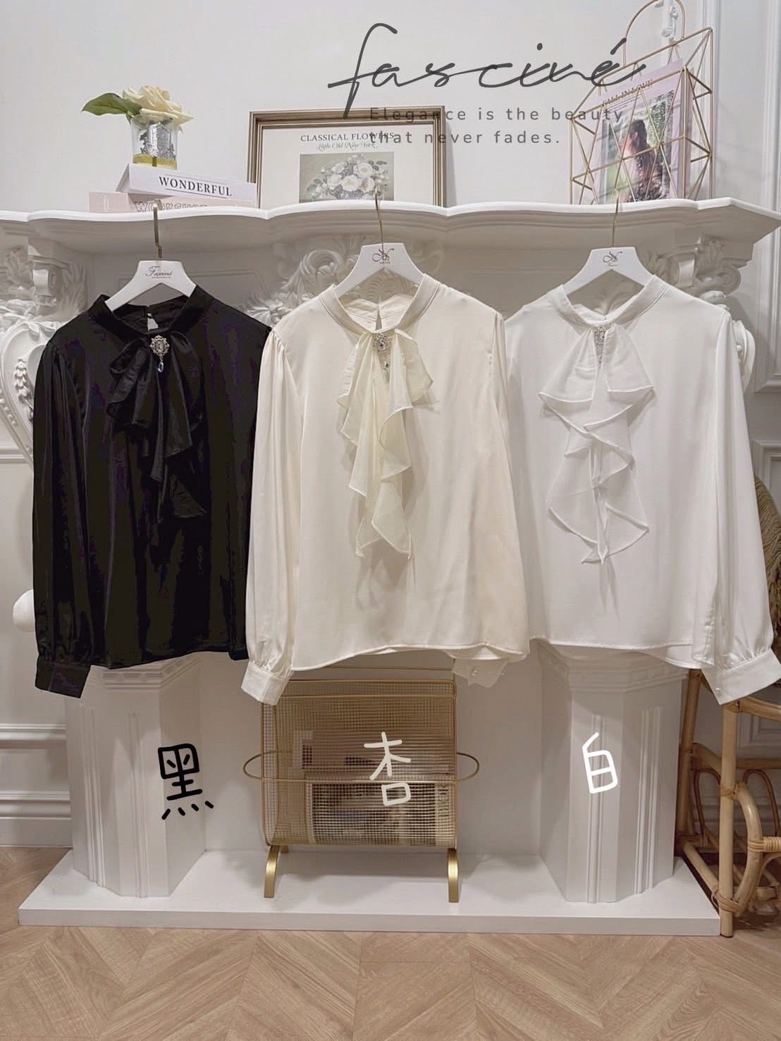 輕盈雪紡帶出微霧光澤,垂墜不貼膚,一穿即有柔和光暈感;立領結構結合層次荷葉,修飾頸肩比例,優雅而俐落;胸前鑽飾低調點睛,通勤、會議到約會皆能自在轉換風格,微寬版型上身更顯修飾。