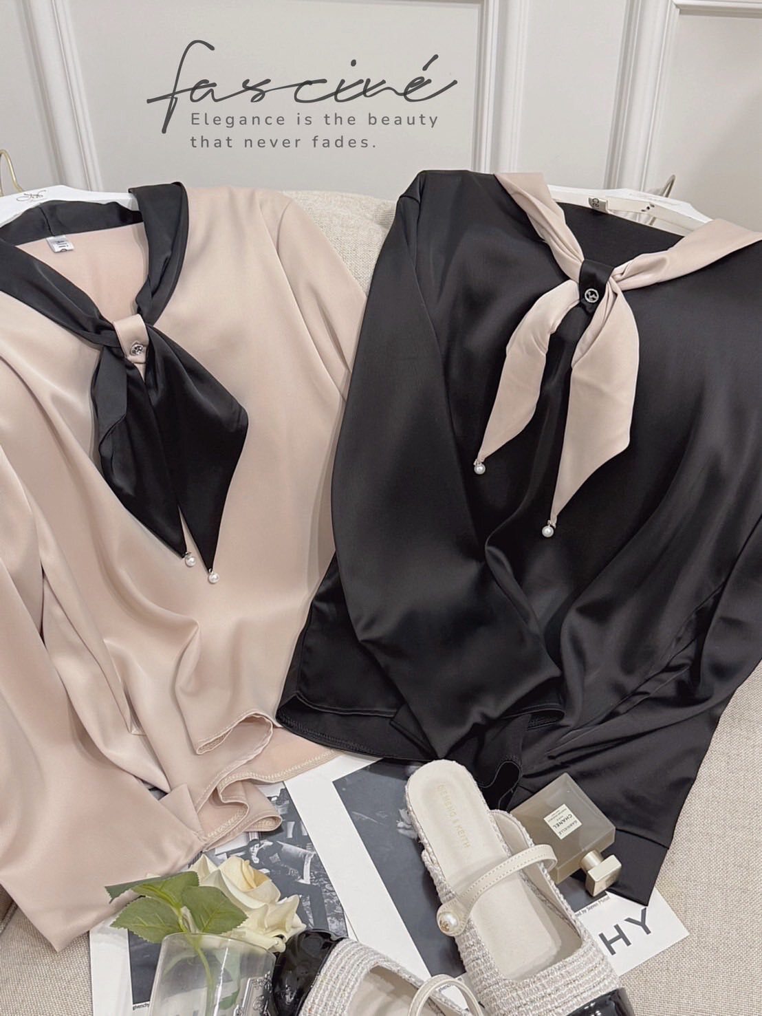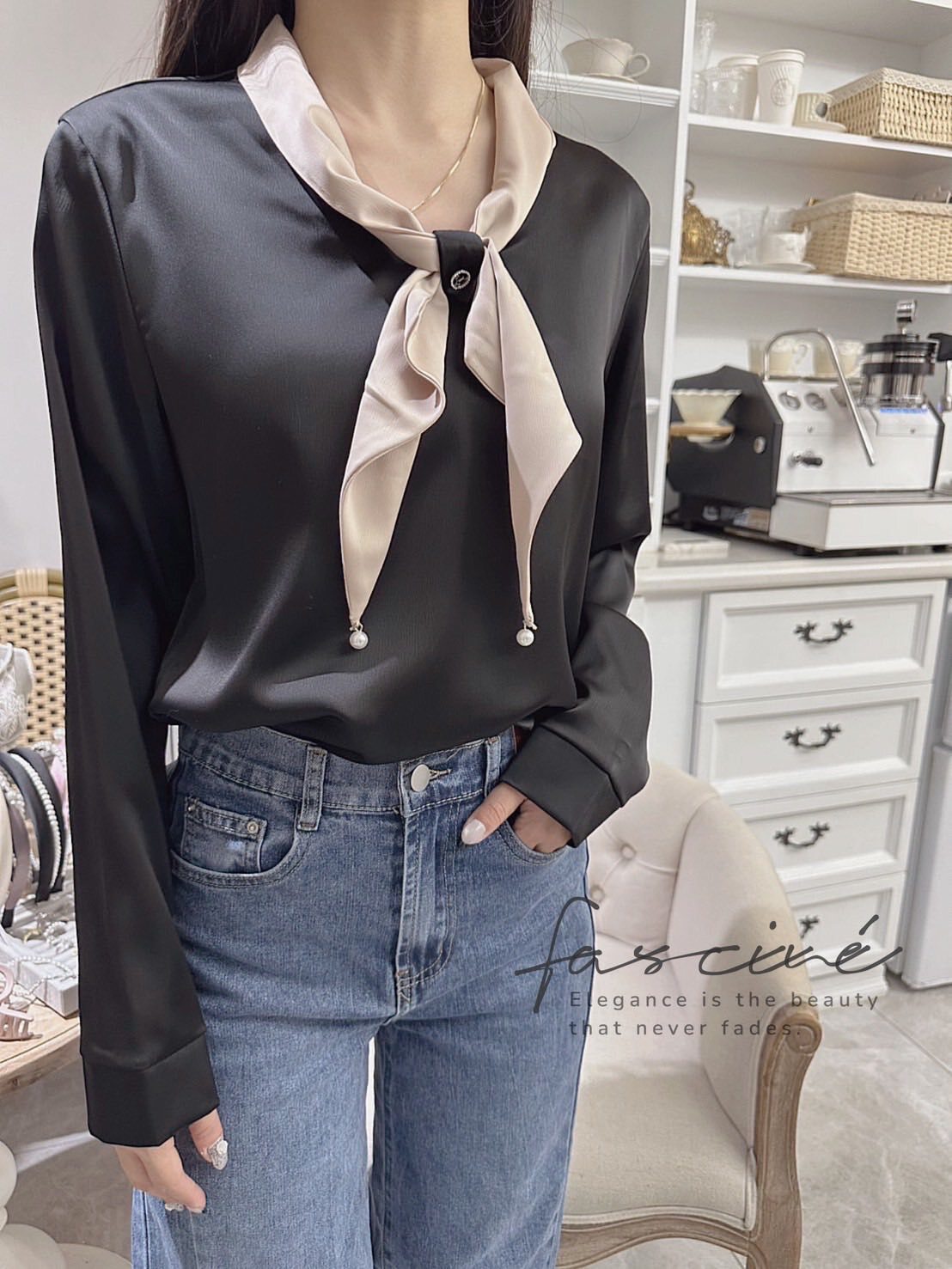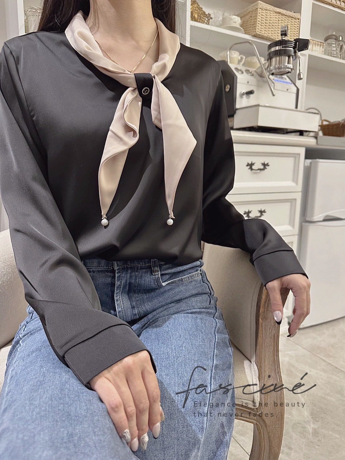 以柔滑緞感結合領口蝴蝶結點綴,微光澤映出高級氣質,辦公到約會一件搞定。微寬袖與俐落版型修飾上身線條,配牛仔或西裝都能展現摩登優雅。領巾可隨心打結或自然垂墜,輕鬆切換正式與日常兩種氛圍。