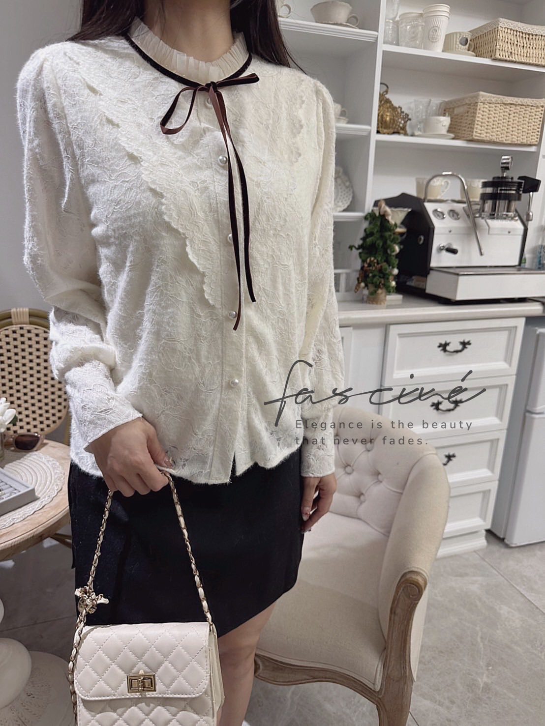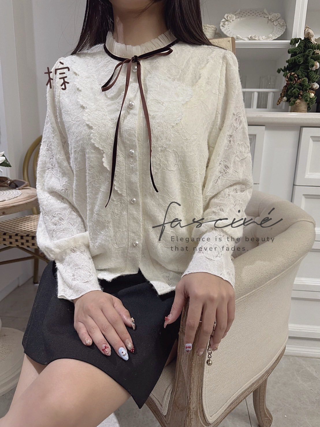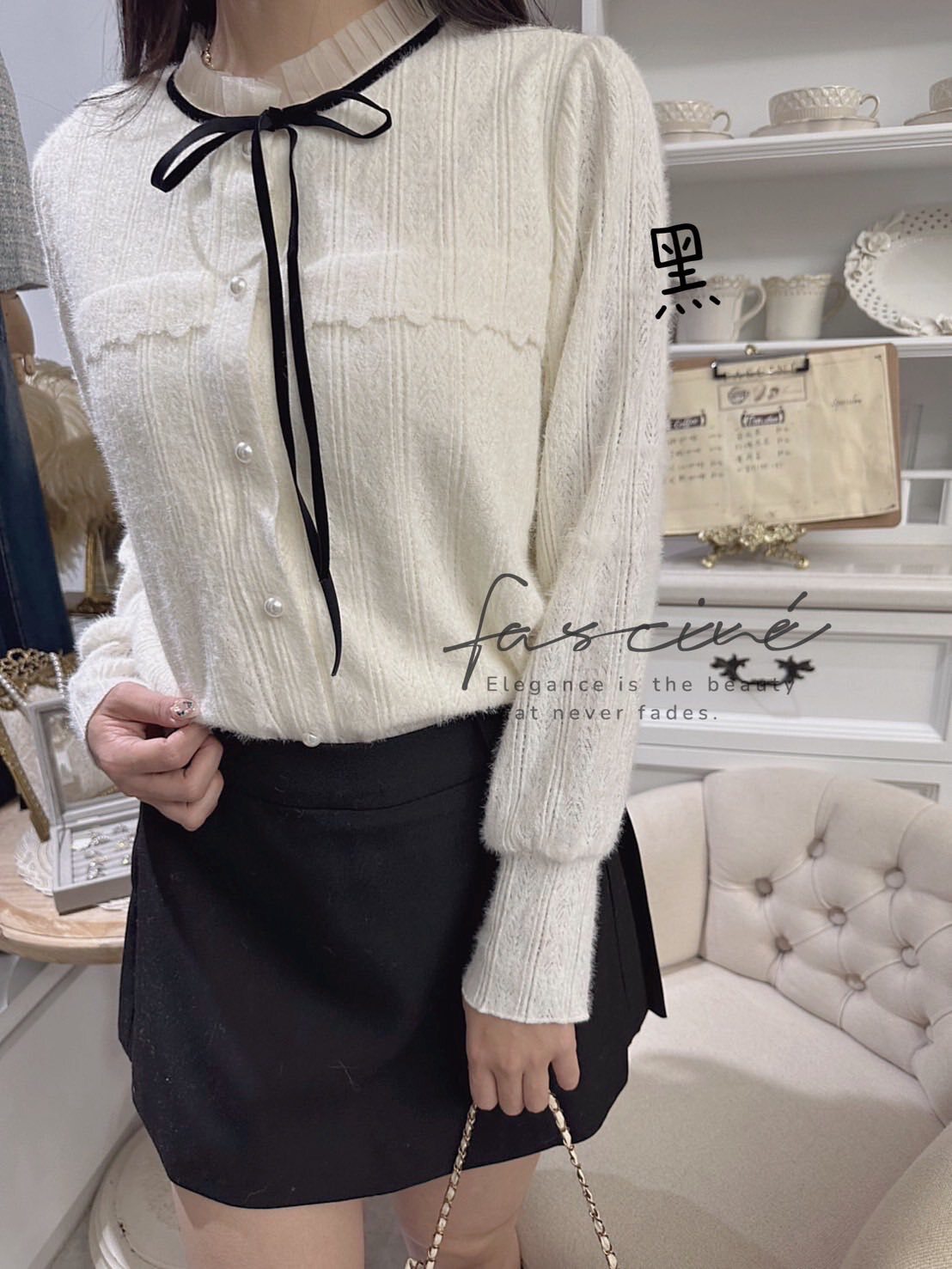 領口綁上細緻法式蝴蝶結,勾勒臉部線條,自帶修飾小臉濾鏡,內裡加絨加厚設計,穿起來柔軟暖和不臃腫,秋冬單穿或當內搭都超實用。立體感蕾花/蕾網織紋沿著門襟延伸到胸口,搭配光澤感珍珠釦,走進咖啡廳、辦公室都散發溫柔小姊姊氣質。