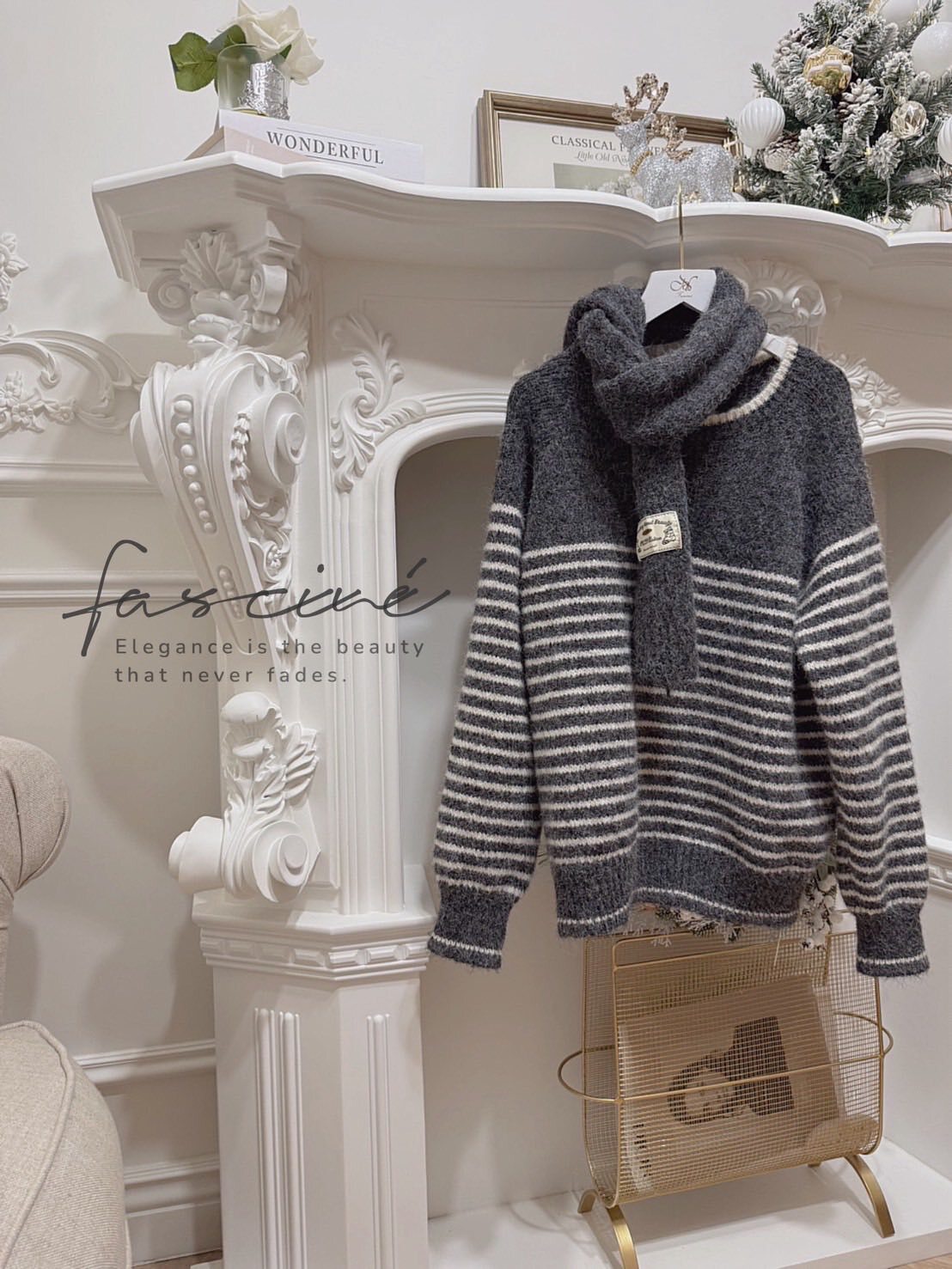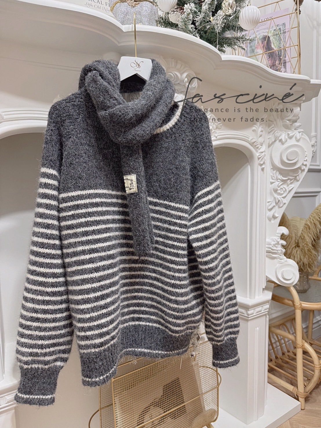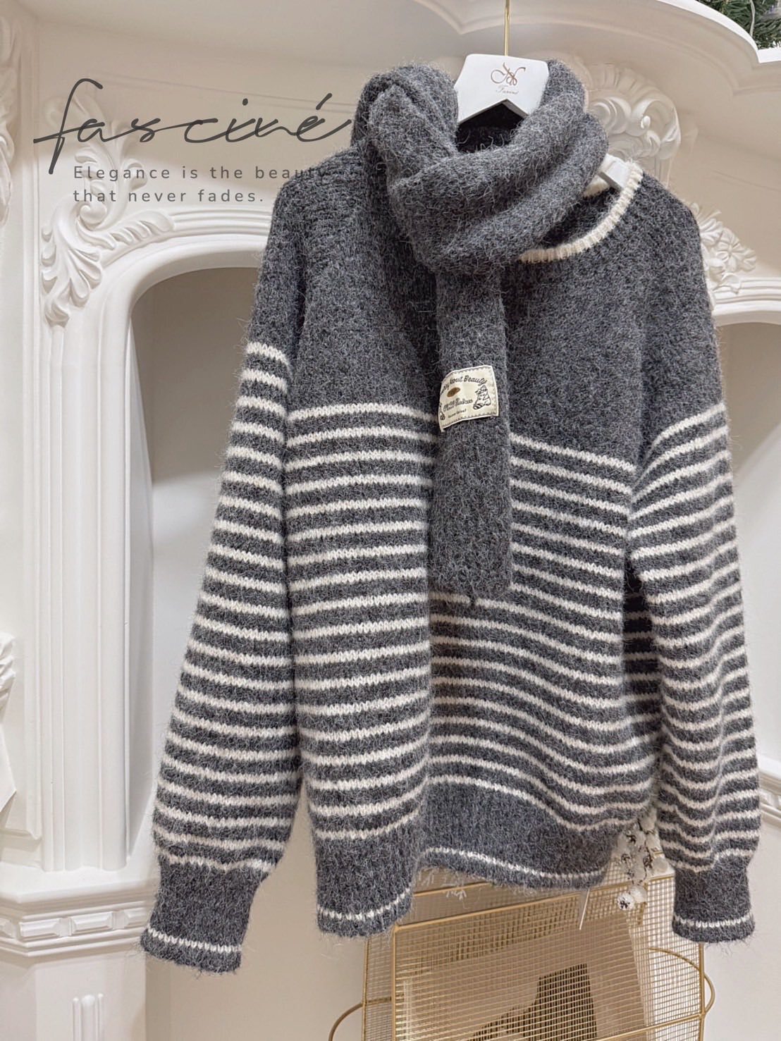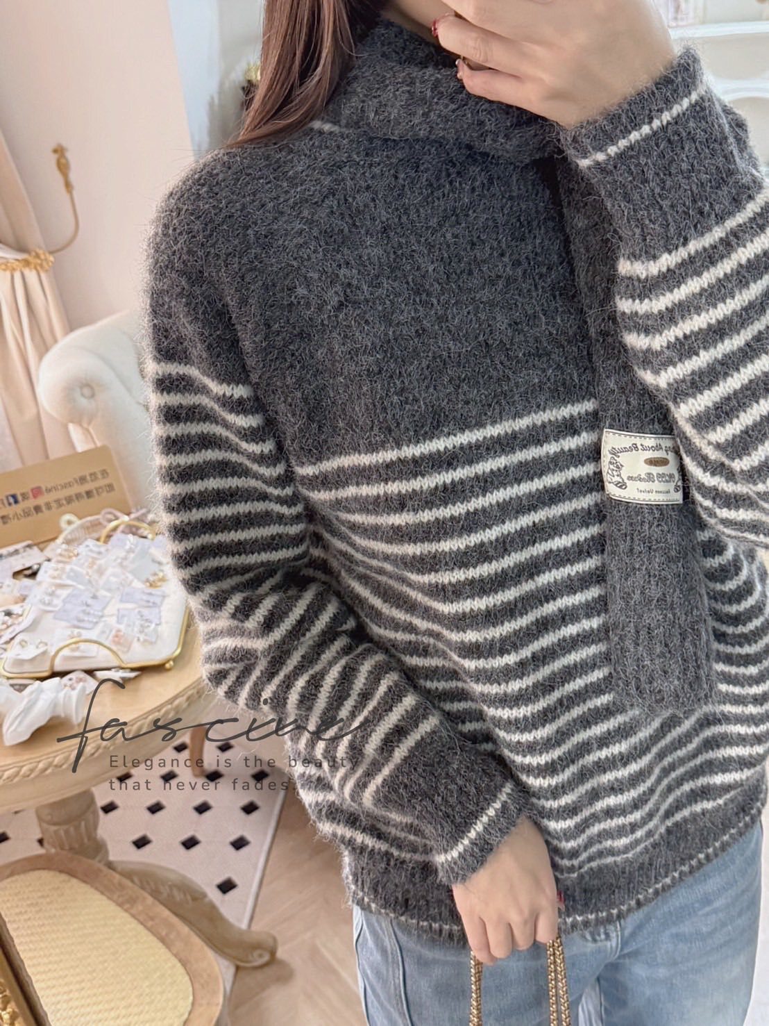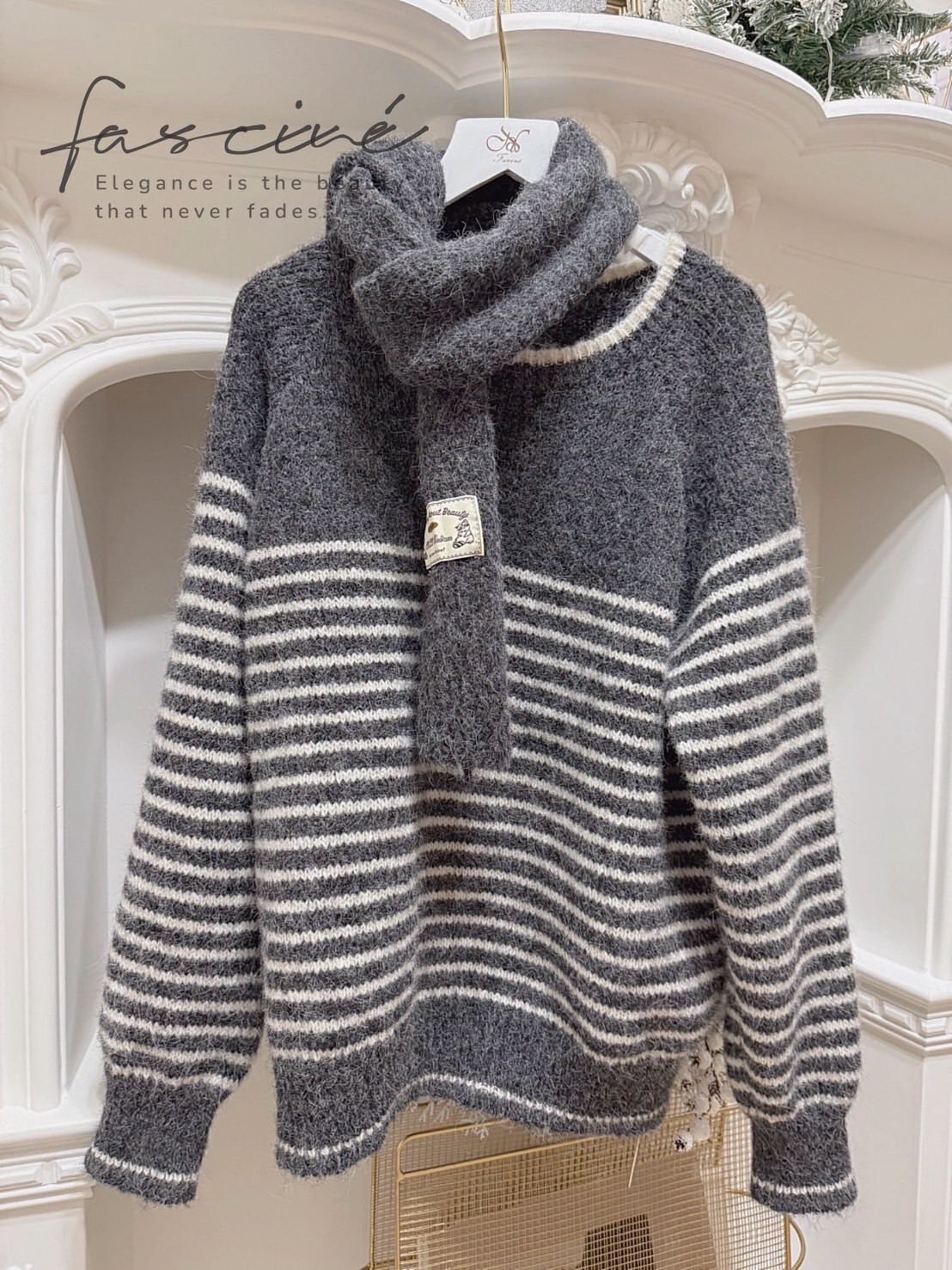 (11T57-25B)法式條紋氣質百搭氛圍感保暖軟糯毛衣+圍巾針織 (毛衣再加上圍巾)