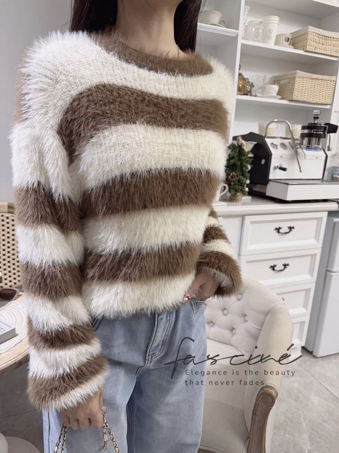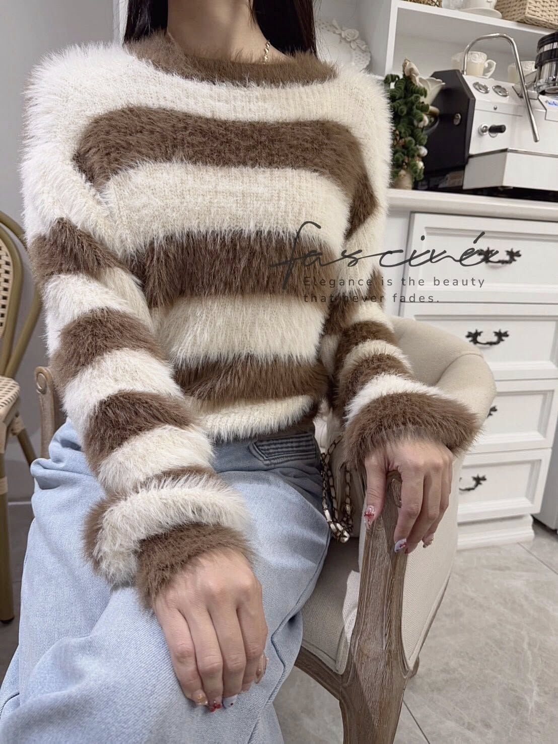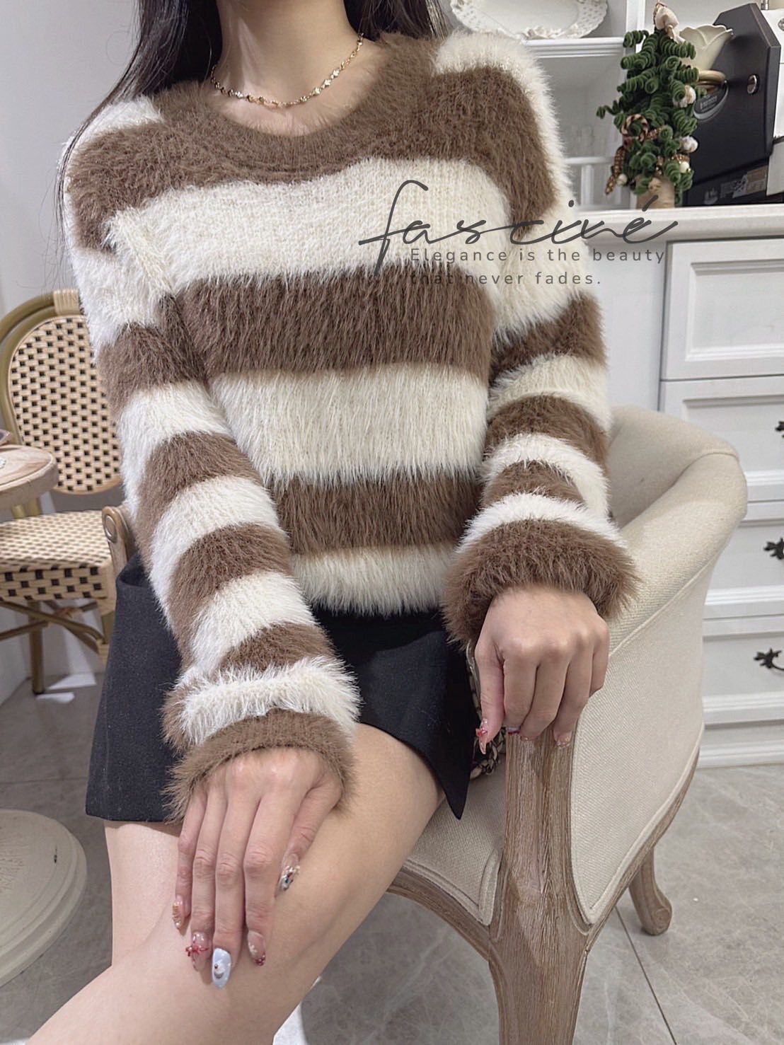 (11T62-25B)法式條紋仿水貂絨毛慵懶軟糯針織上衣$490