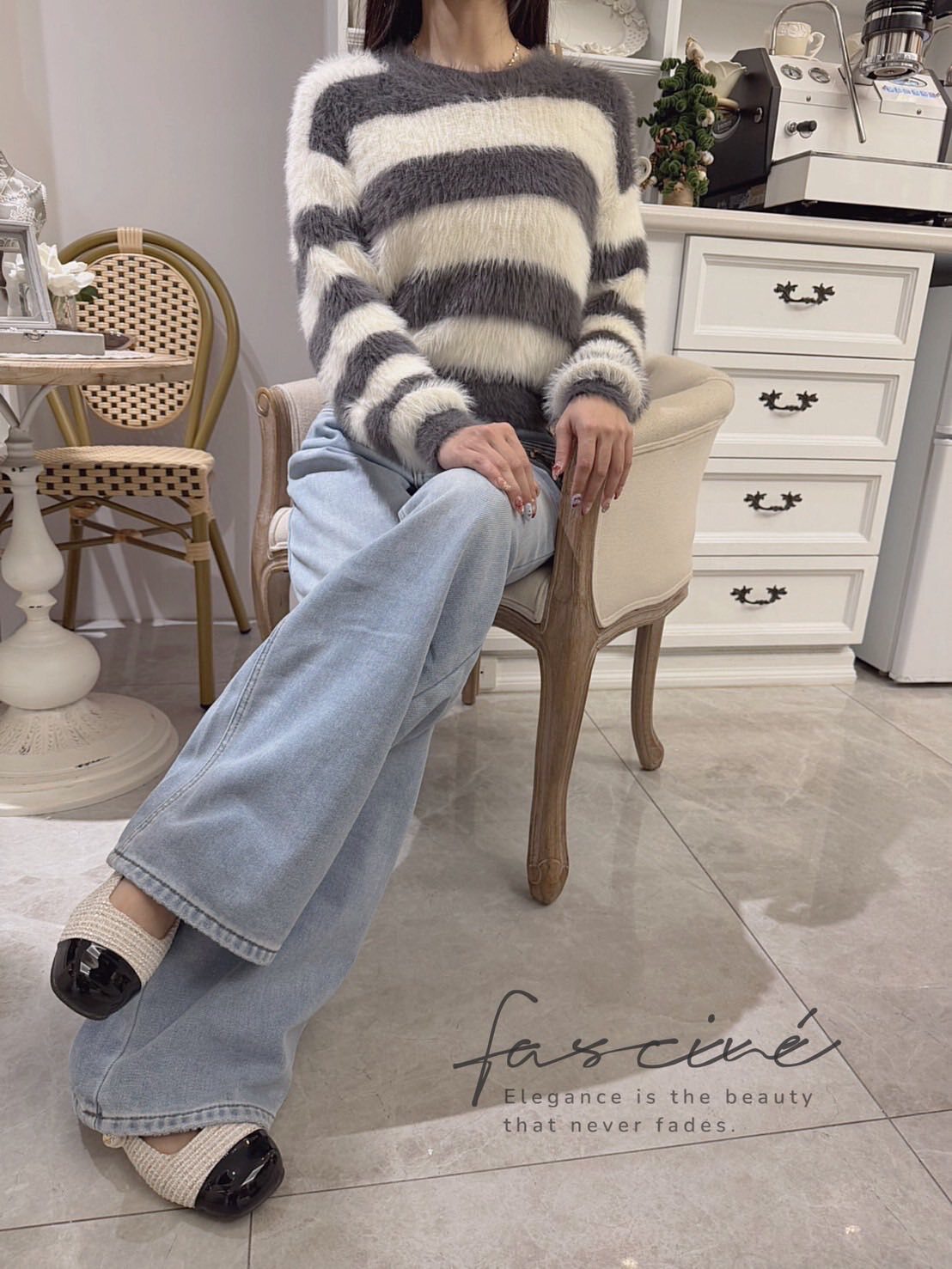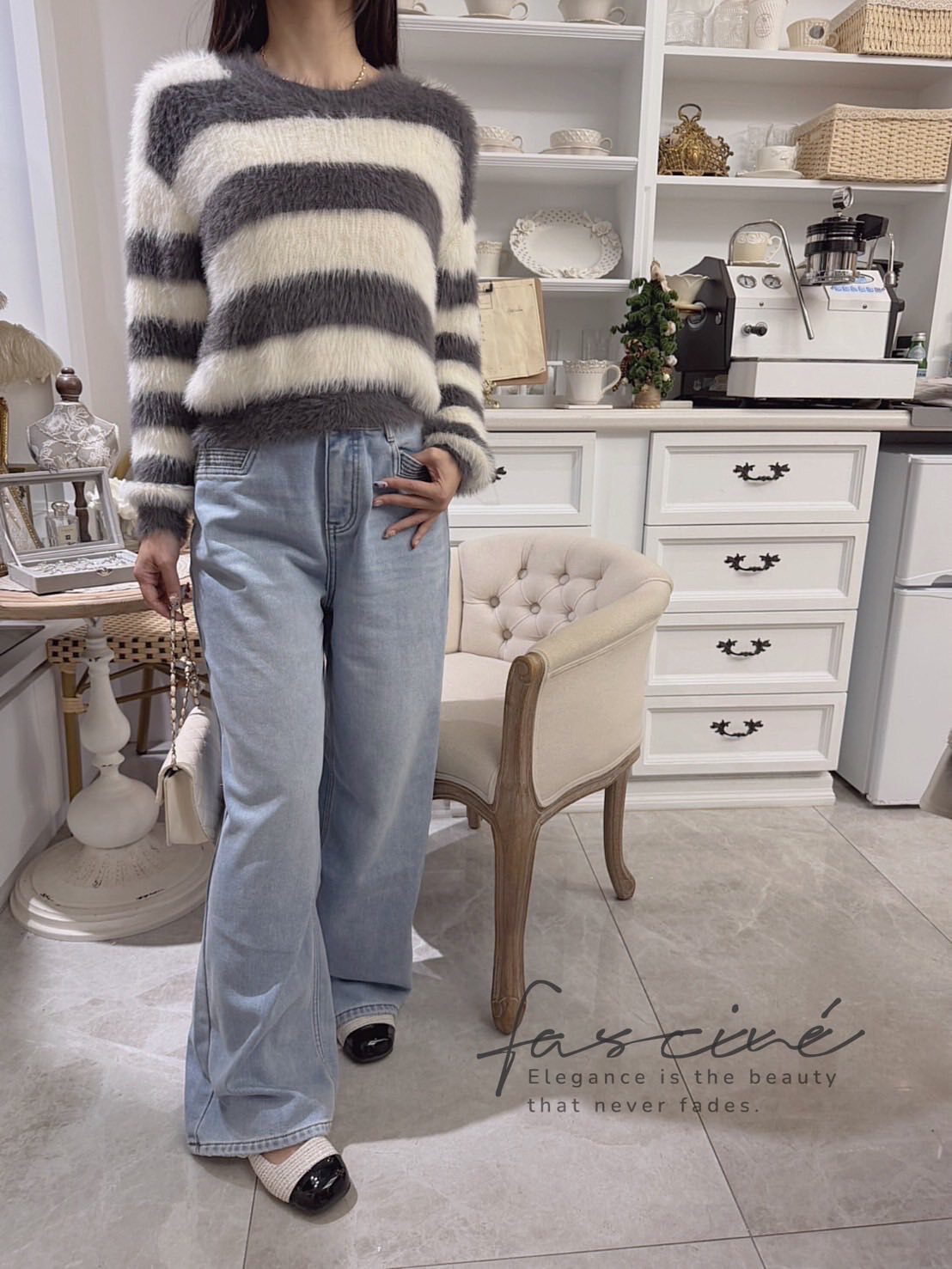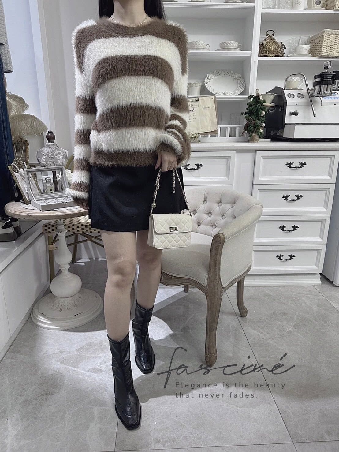 (11T62-25B)法式條紋仿水貂絨毛慵懶軟糯針織上衣$490