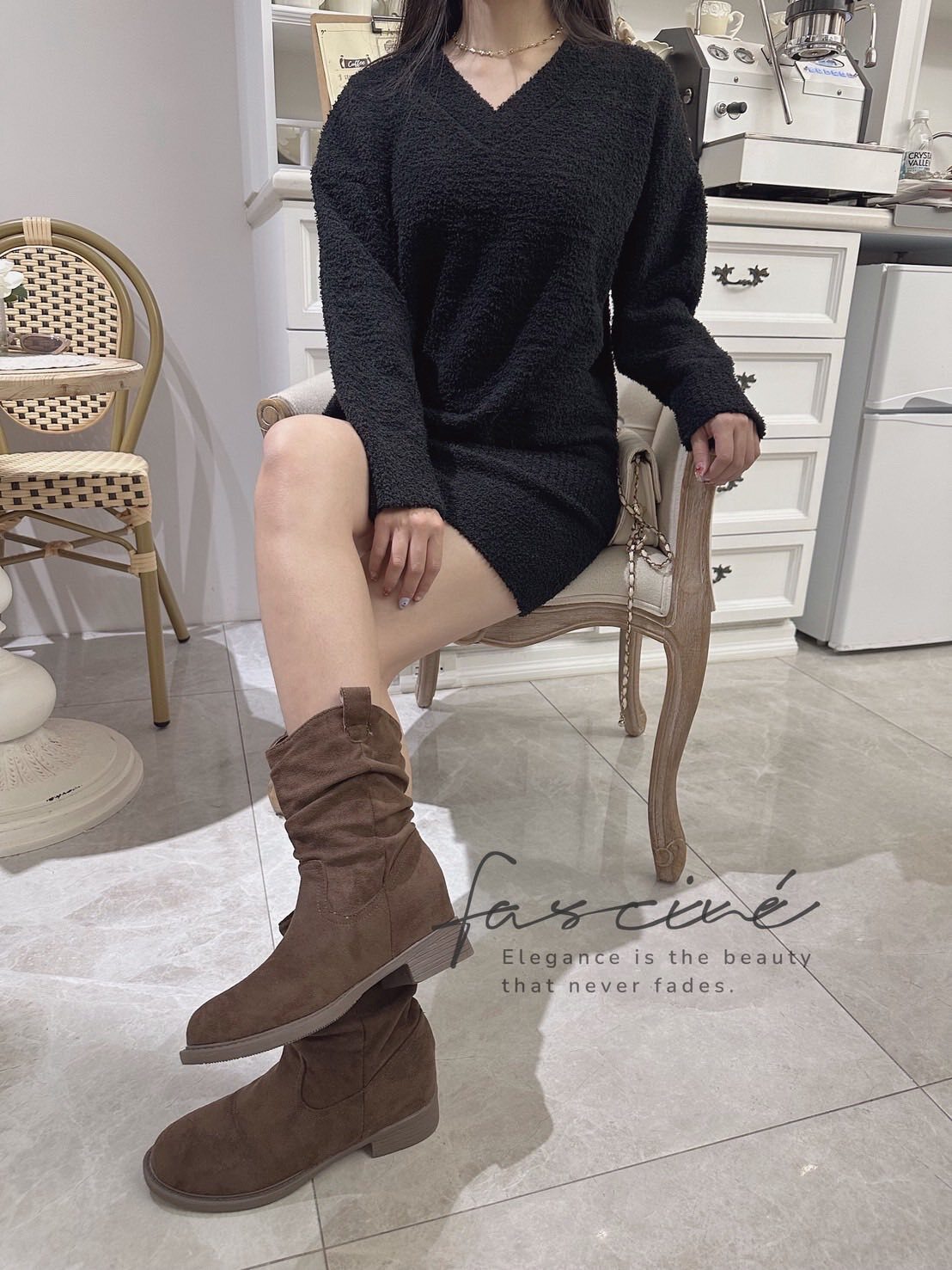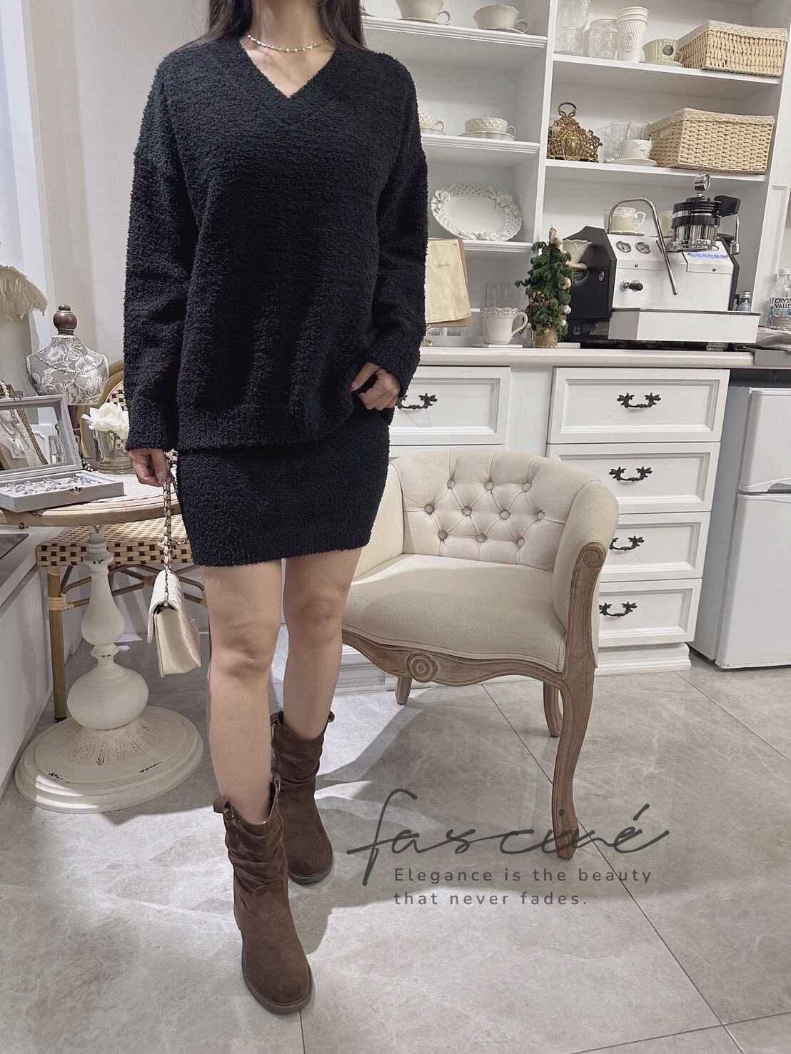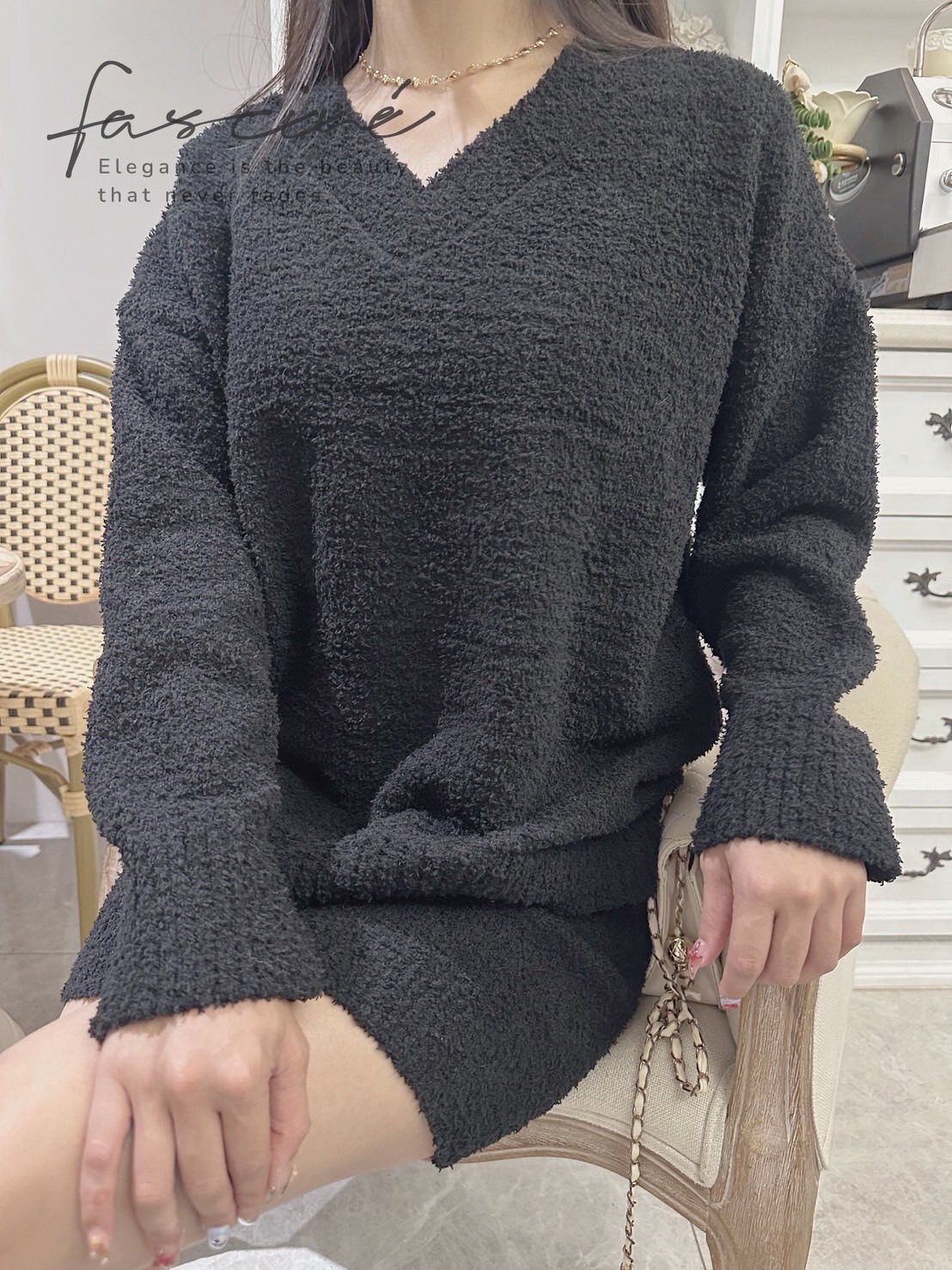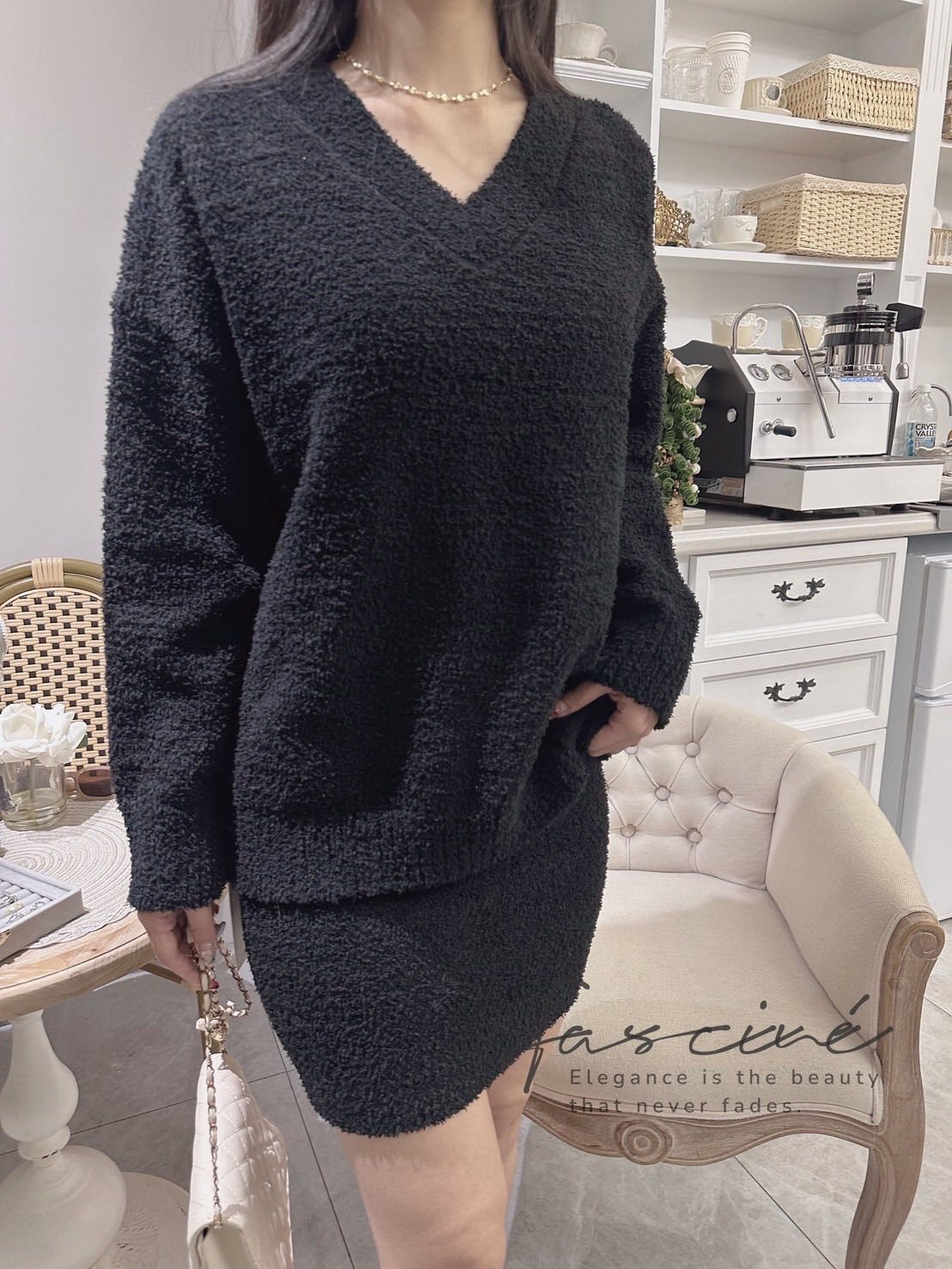 (11T65-2B)法式軟綿厚絨V領慵懶針織上衣+短裙$690(兩件套)