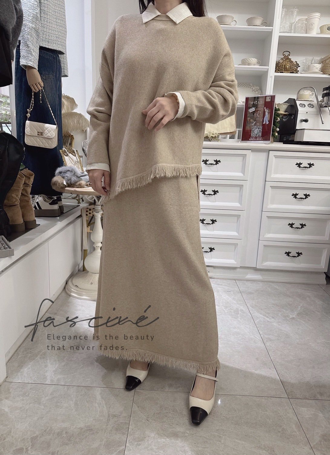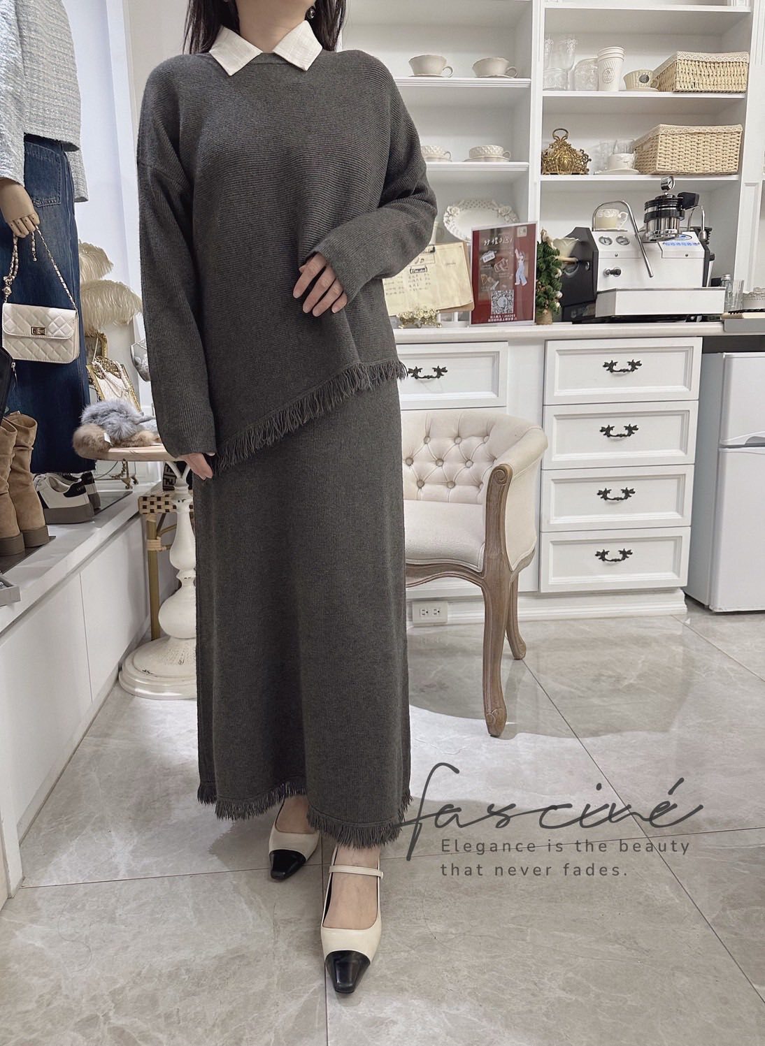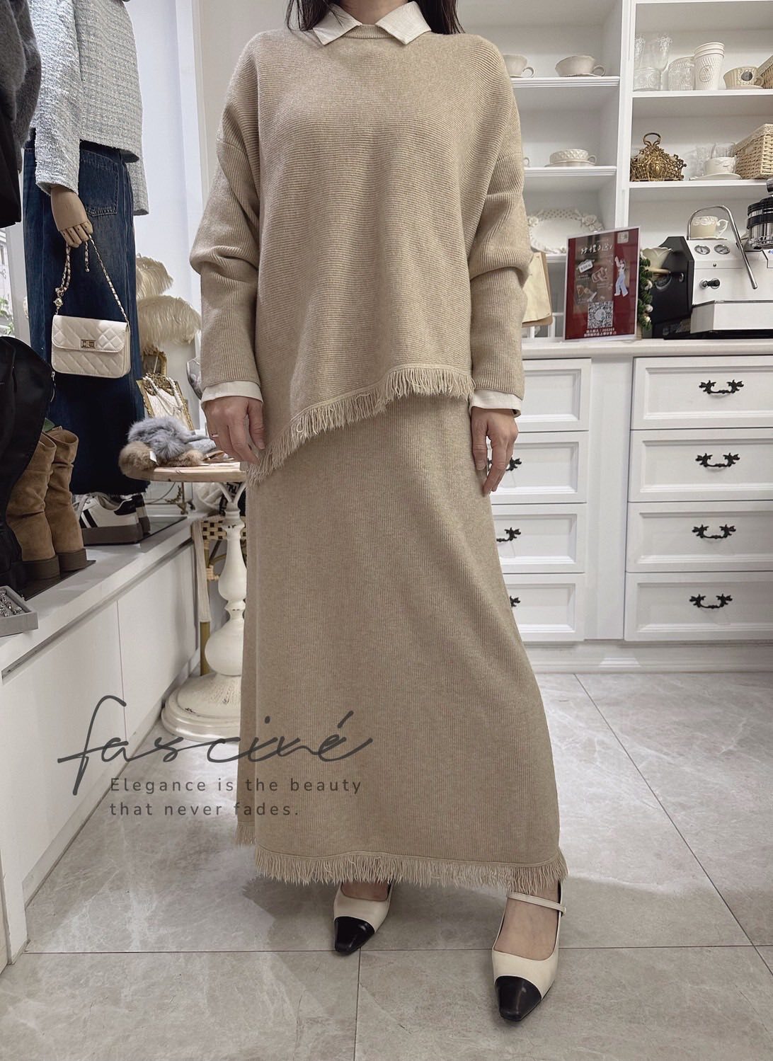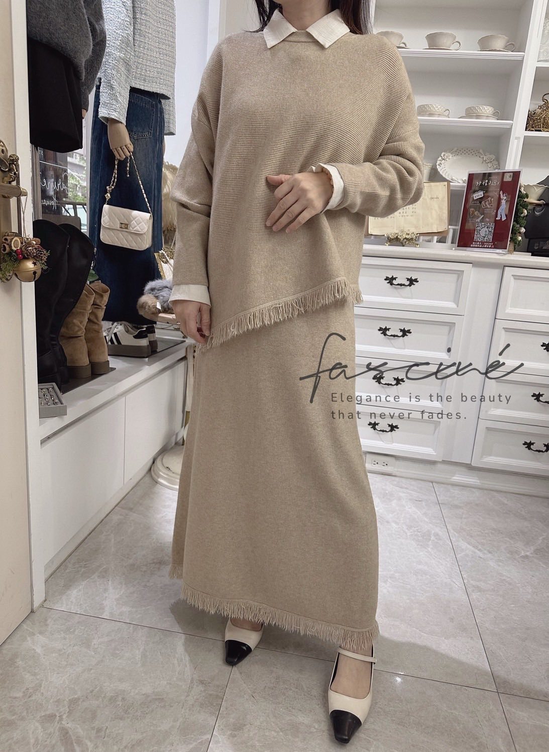 柔軟混紡針織搭配微寬鬆版型,下斜剪裁與細緻流蘇垂墜修飾腰腹與臀部線條,走動間自然搖曳超顯瘦。上短下長的比例拉高腰線,長裙優雅包覆腿部線條,不貼身卻有修身效果,日常通勤、約會聚餐一套搞定。溫柔霧感色系,高級不挑膚,單穿或拆開與衣櫥單品互搭,都能營造慵懶卻有質感的冬日氛圍。