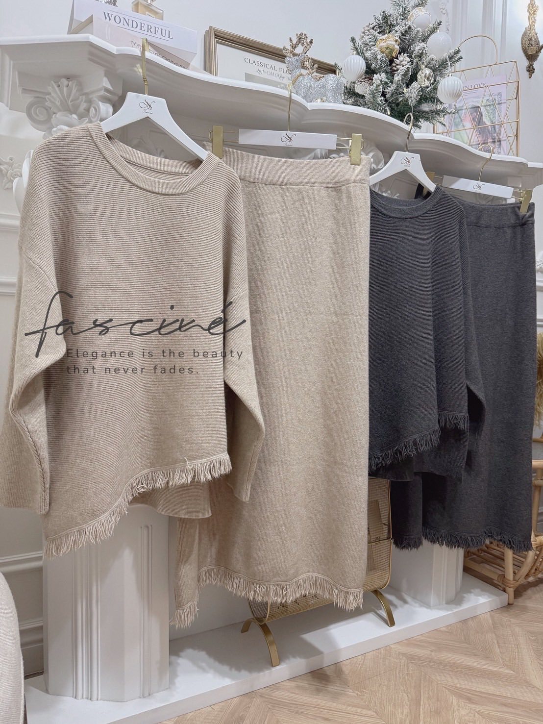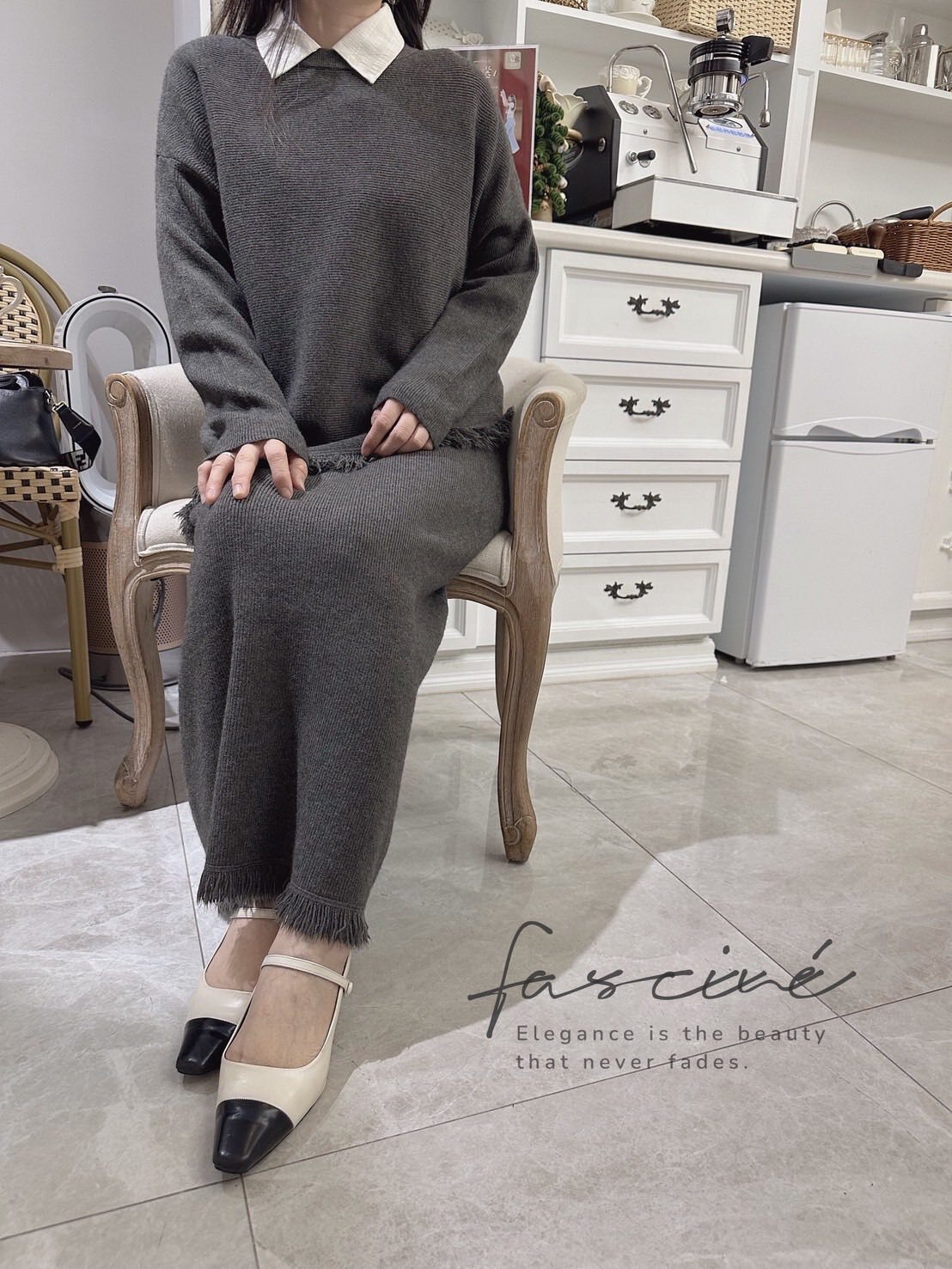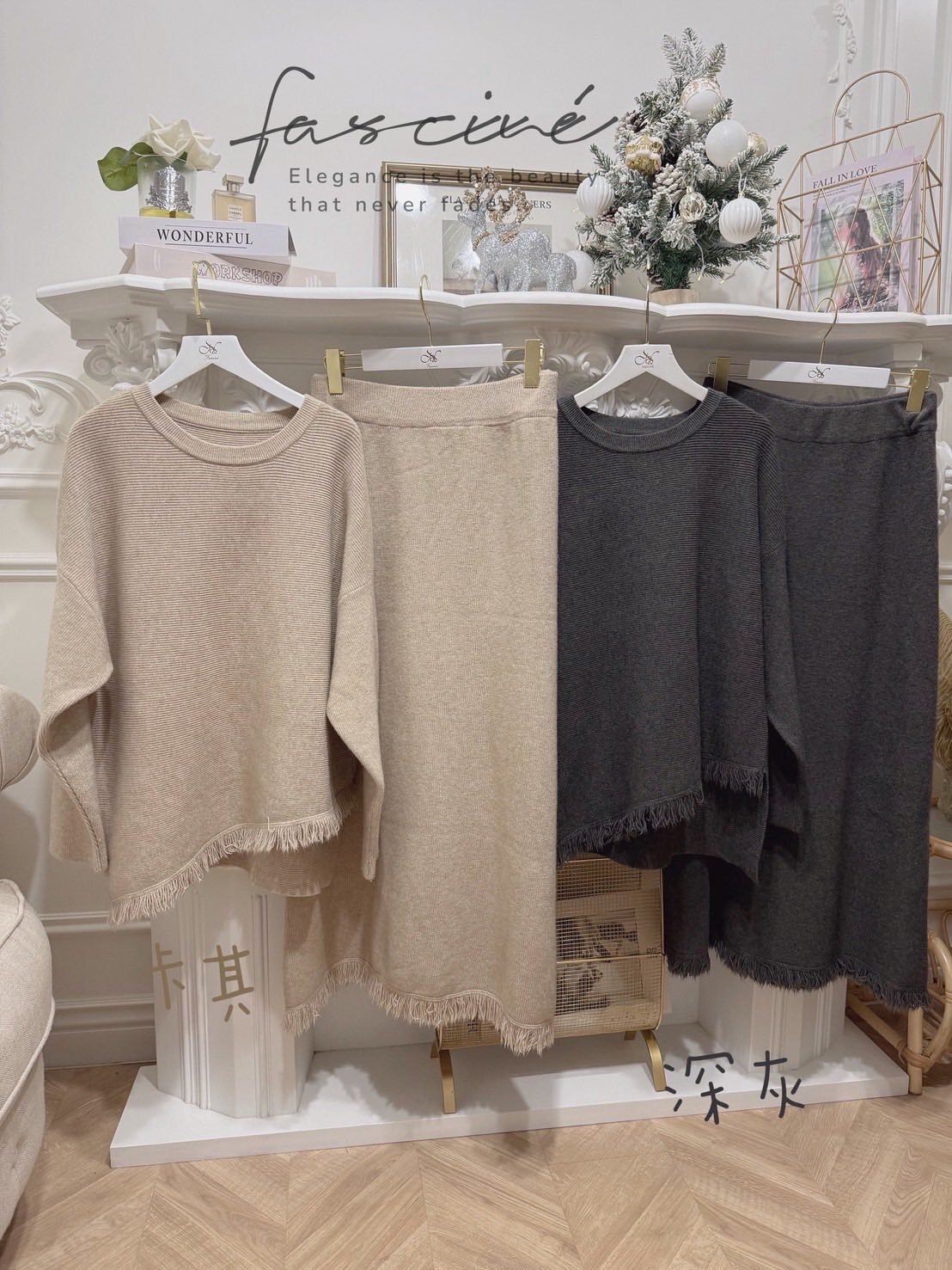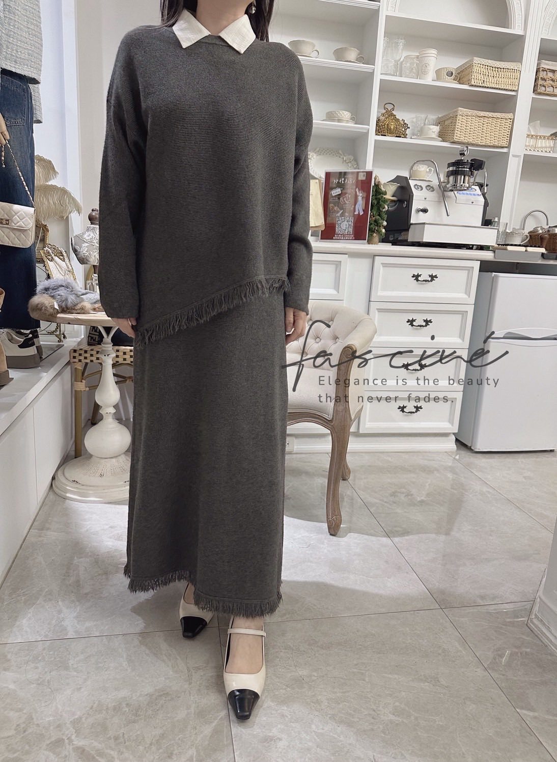 柔軟混紡針織搭配微寬鬆版型,下斜剪裁與細緻流蘇垂墜修飾腰腹與臀部線條,走動間自然搖曳超顯瘦。上短下長的比例拉高腰線,長裙優雅包覆腿部線條,不貼身卻有修身效果,日常通勤、約會聚餐一套搞定。溫柔霧感色系,高級不挑膚,單穿或拆開與衣櫥單品互搭,都能營造慵懶卻有質感的冬日氛圍。