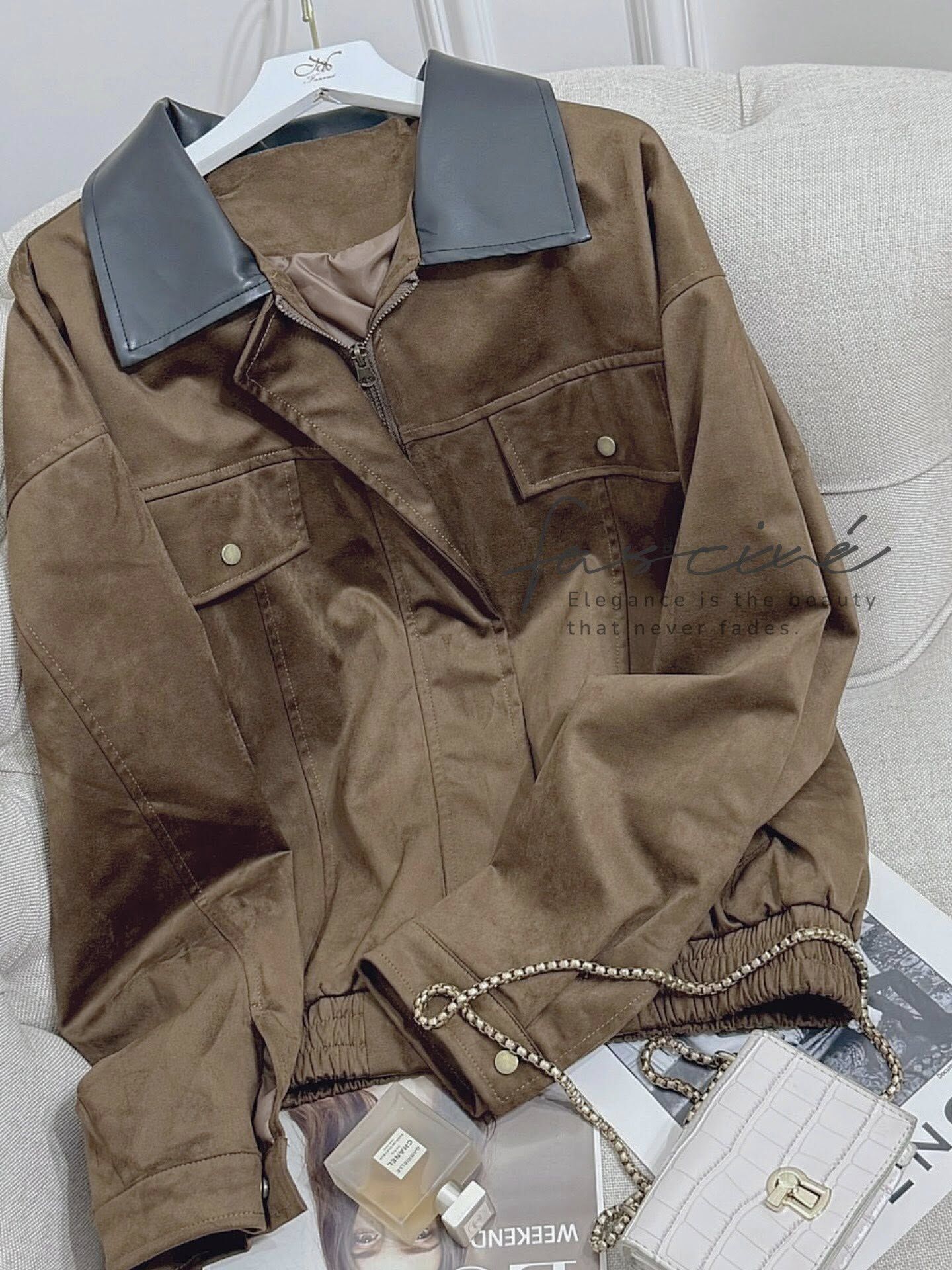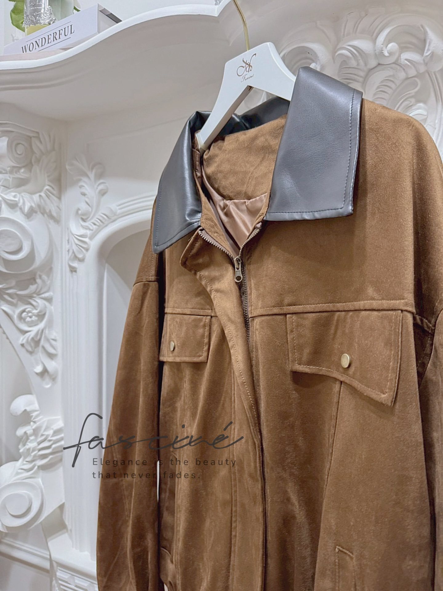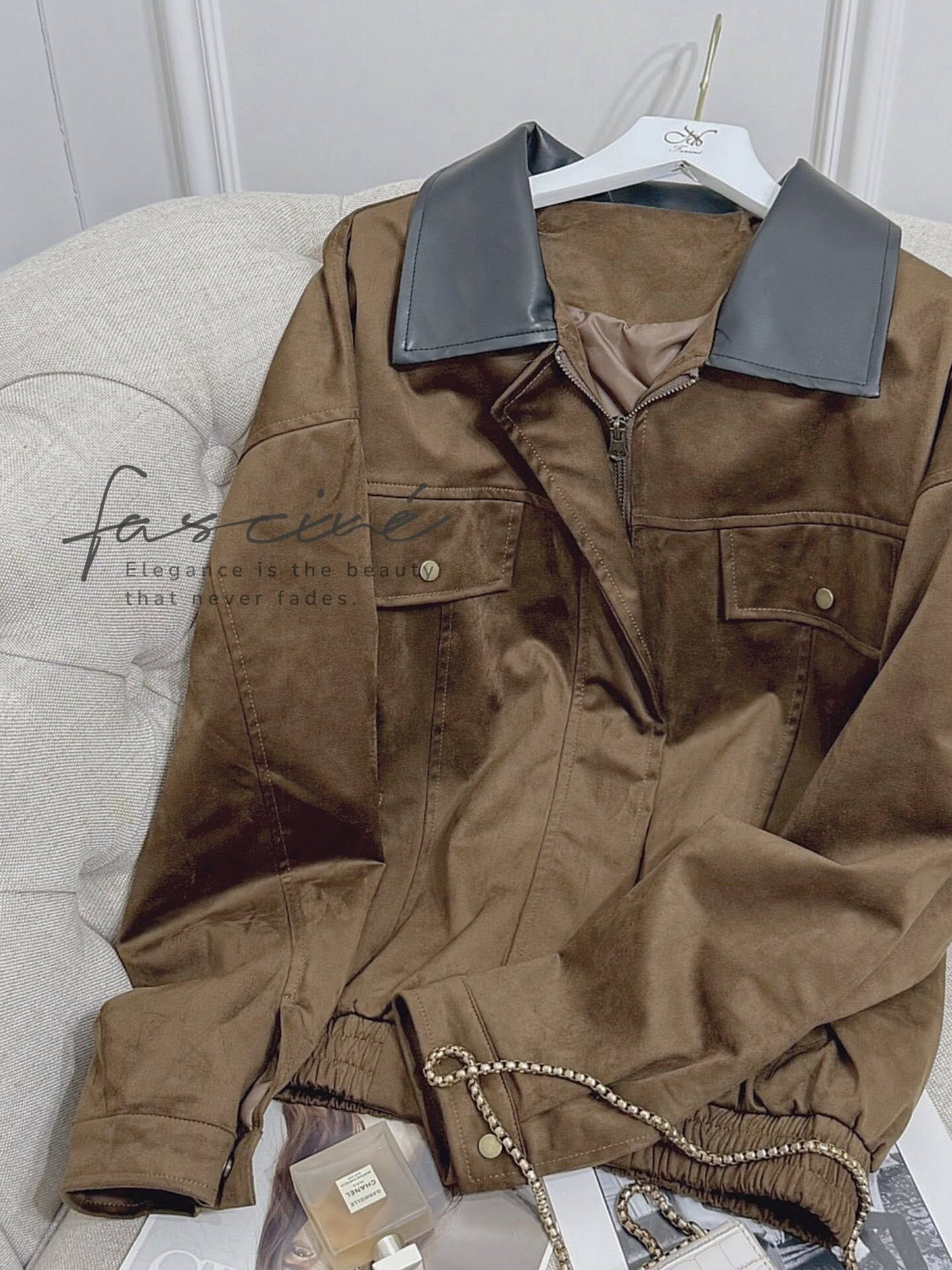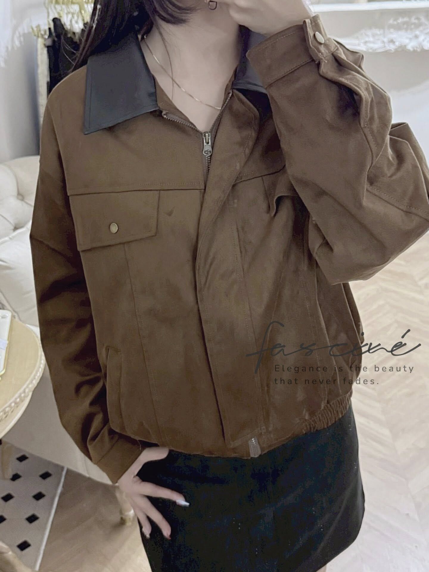 咖啡色麂皮絨 × 翻領夾克版型,溫柔又有態度的休閒時尚外套,有一種質感,是輕輕穿上去就能感覺到的,柔軟的麂皮絨面料、帶一點復古的霧面光澤,像是把巴黎街角的隨性套在身上。