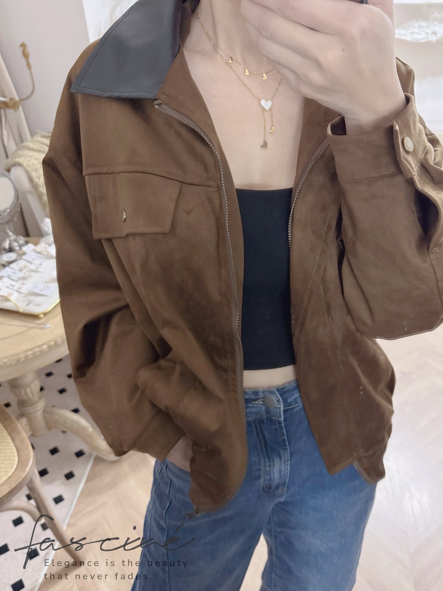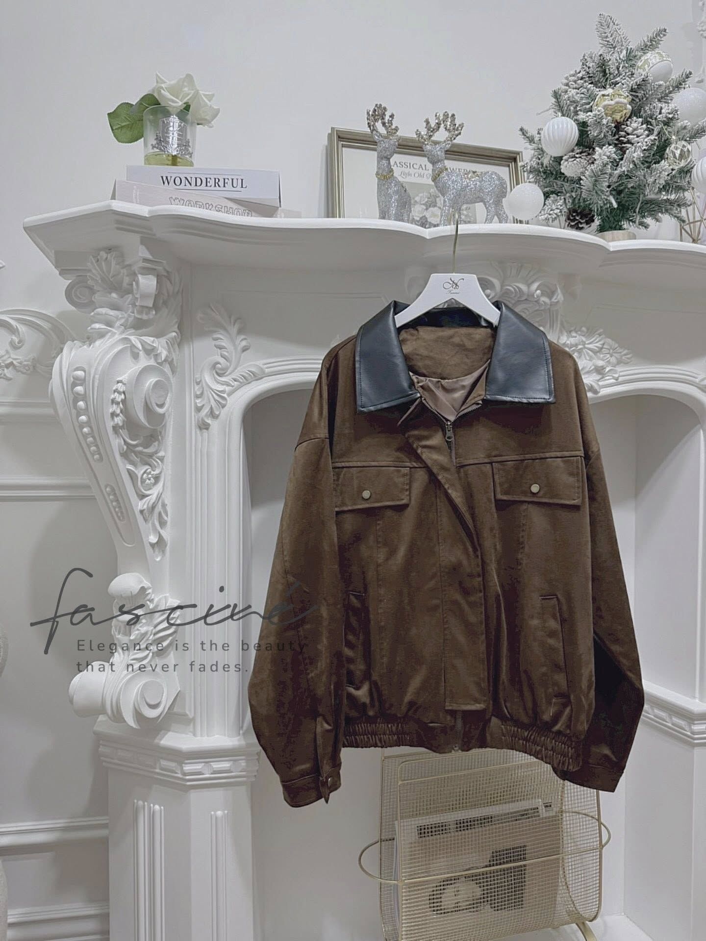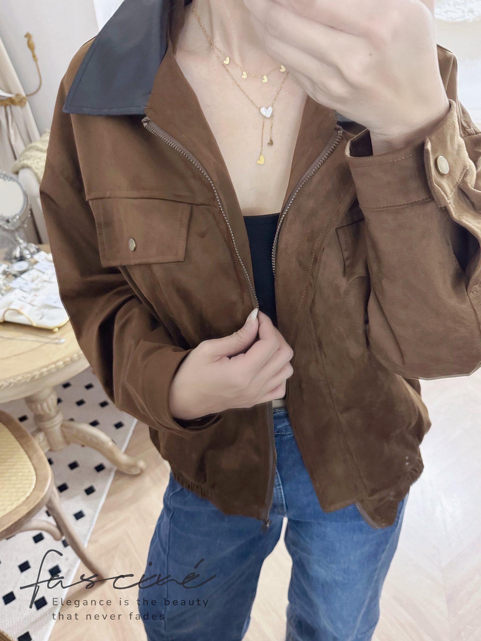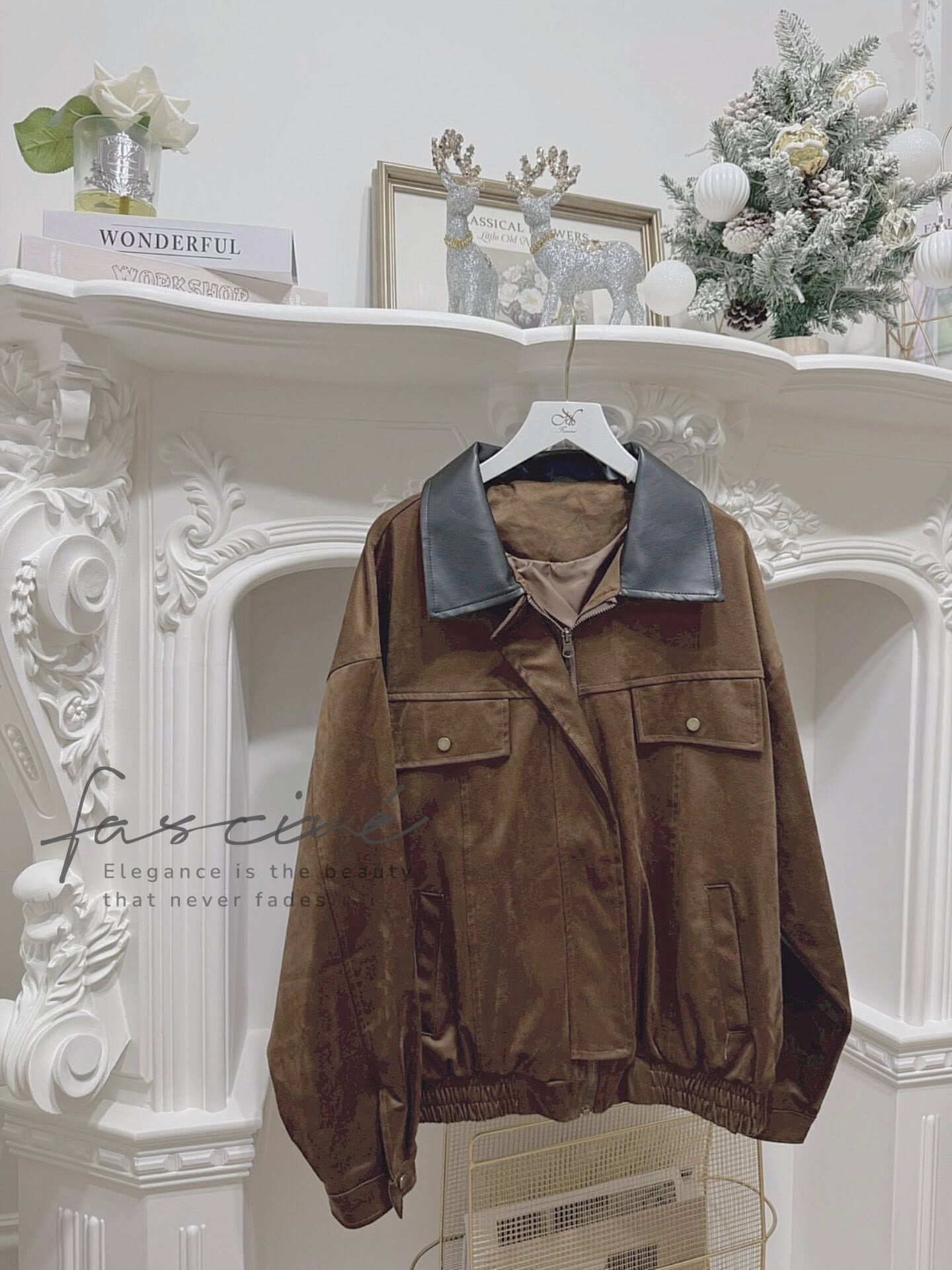 咖啡色麂皮絨 × 翻領夾克版型,溫柔又有態度的休閒時尚外套,有一種質感,是輕輕穿上去就能感覺到的,柔軟的麂皮絨面料、帶一點復古的霧面光澤,像是把巴黎街角的隨性套在身上。