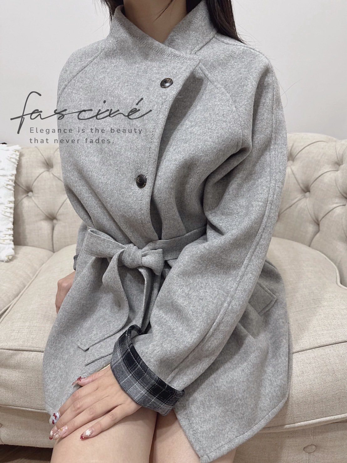 灰霧色調搭配立體斜排釦與綁帶設計,一秒穿出法式女子隨性又有腰身的小心機,輕鬆拉長比例。