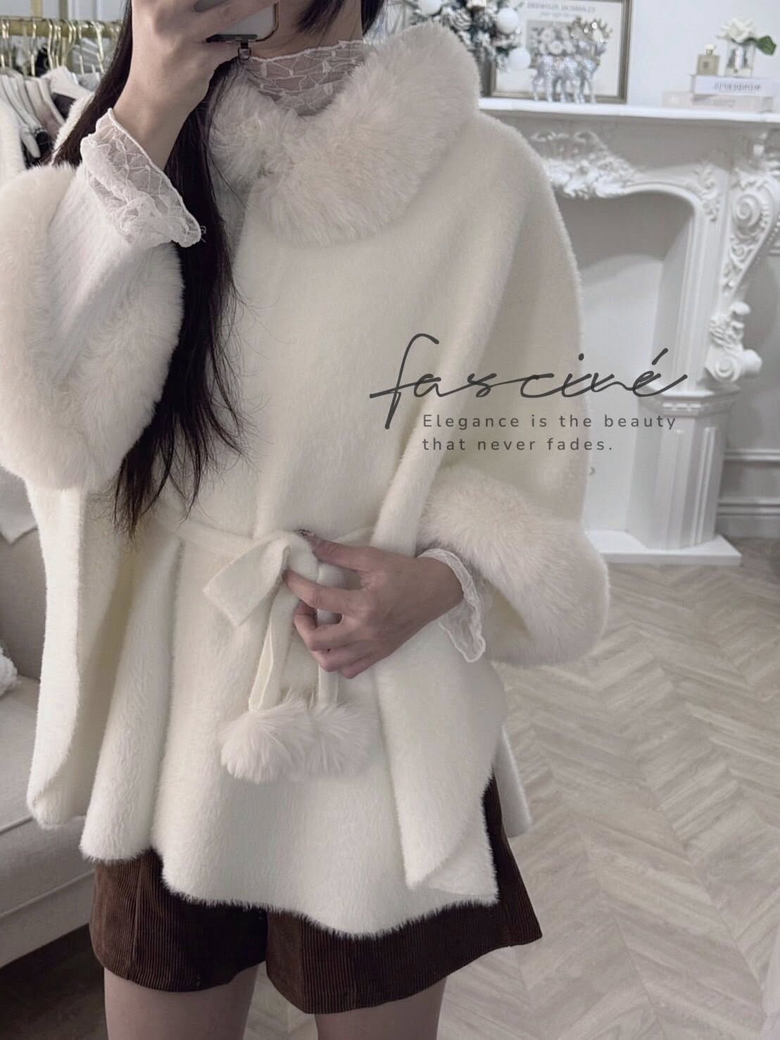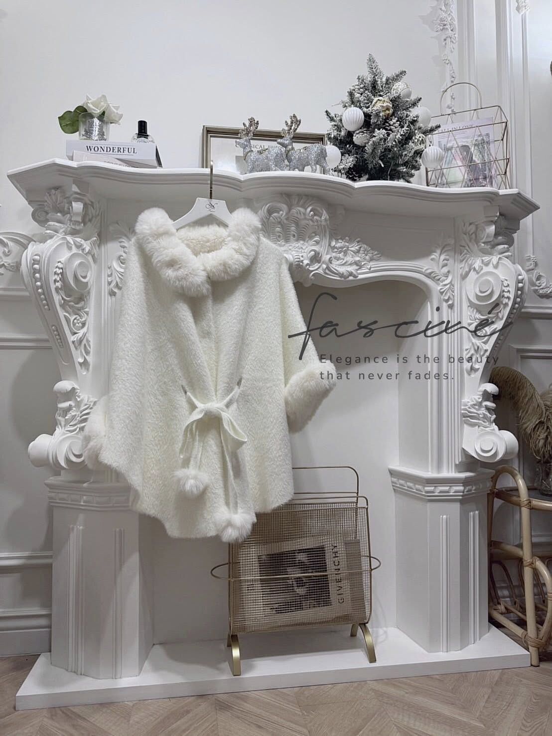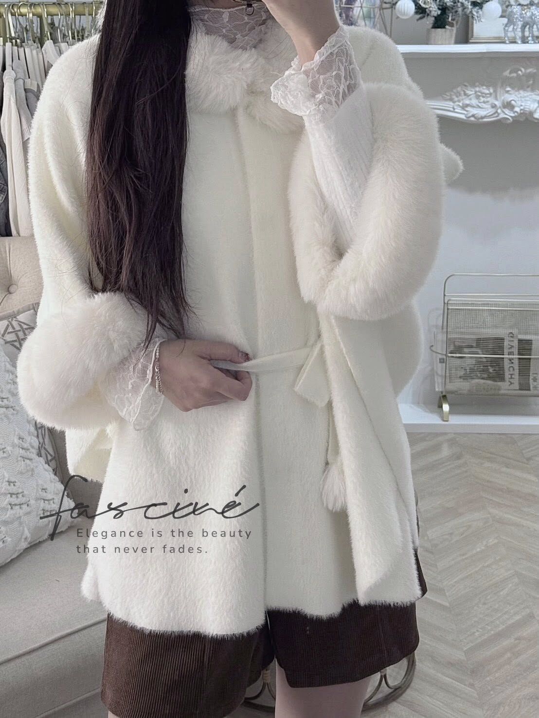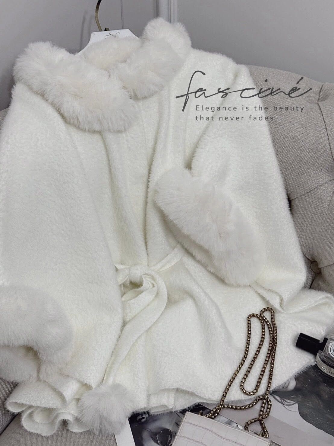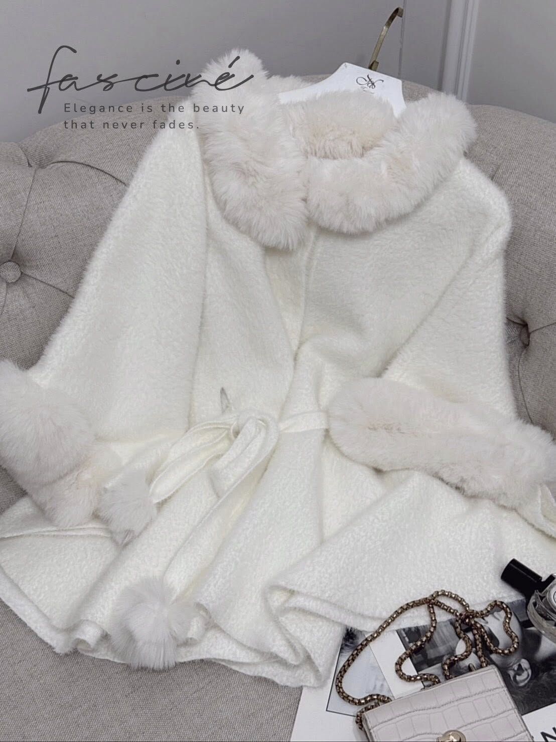 從領口到袖口一圈柔軟毛毛勾勒出精緻臉部線條,披肩式斗篷版型自然修飾肩背與腰腹,小個子也能穿出高級氣場。蓬鬆卻不臃腫的混紡面料,加上綁帶收腰與毛球細節,微微一繫就有法式名媛的溫柔浪漫,約會、年節聚會一件搞定。