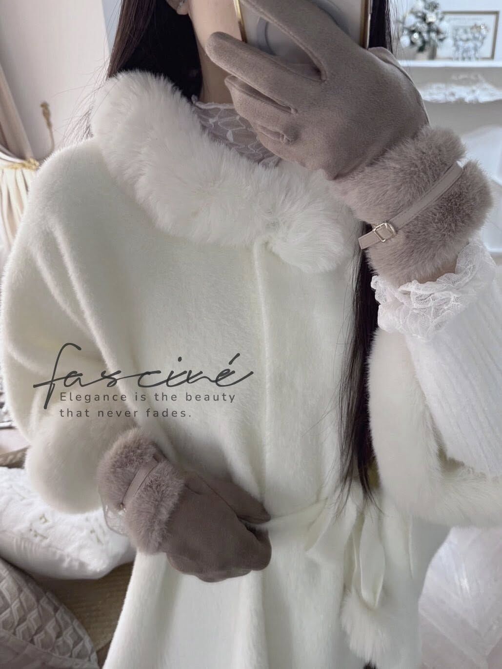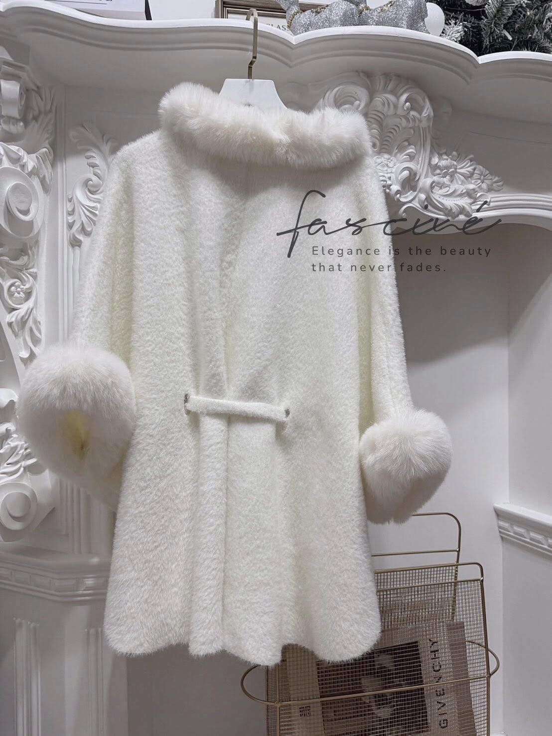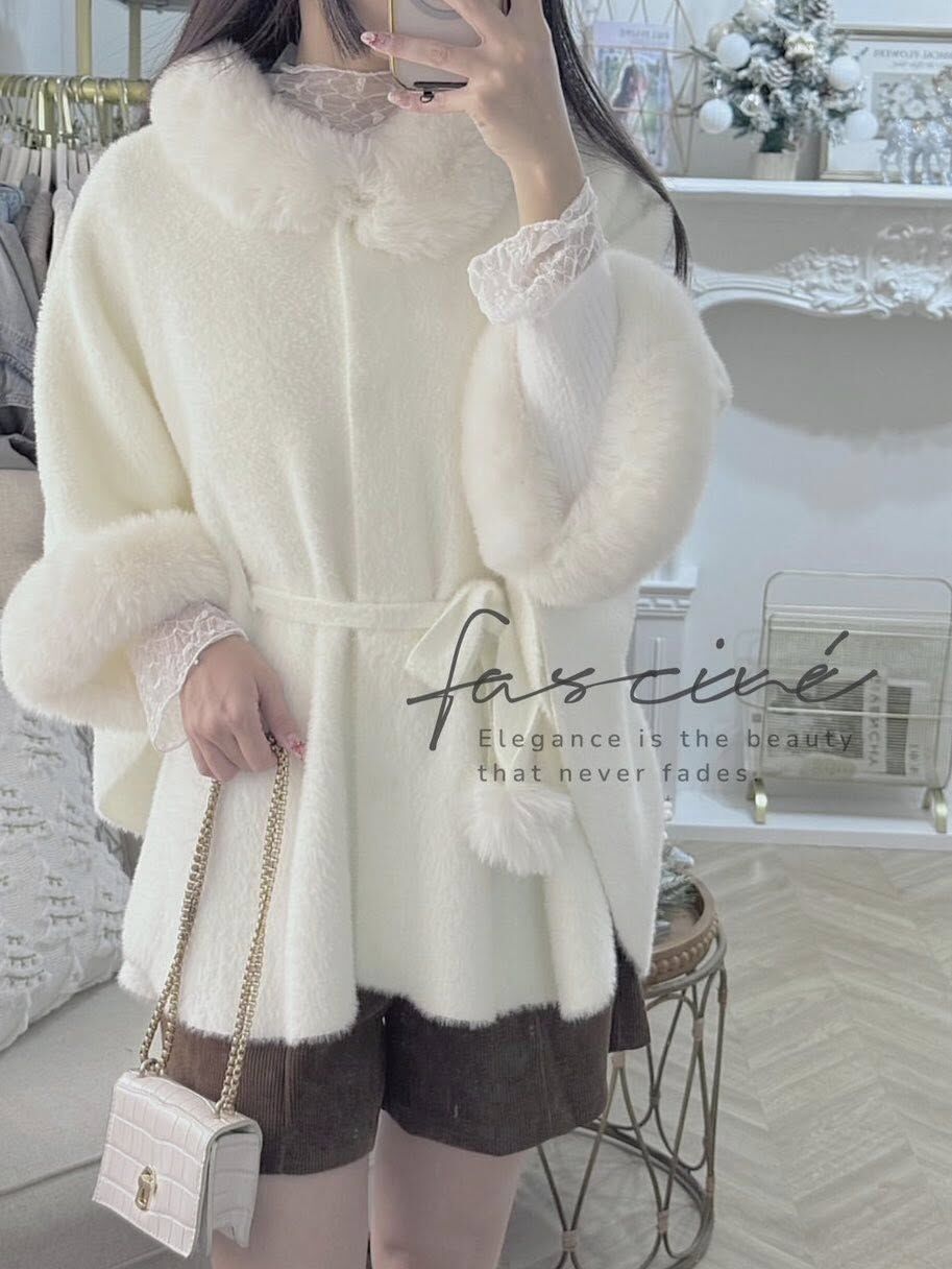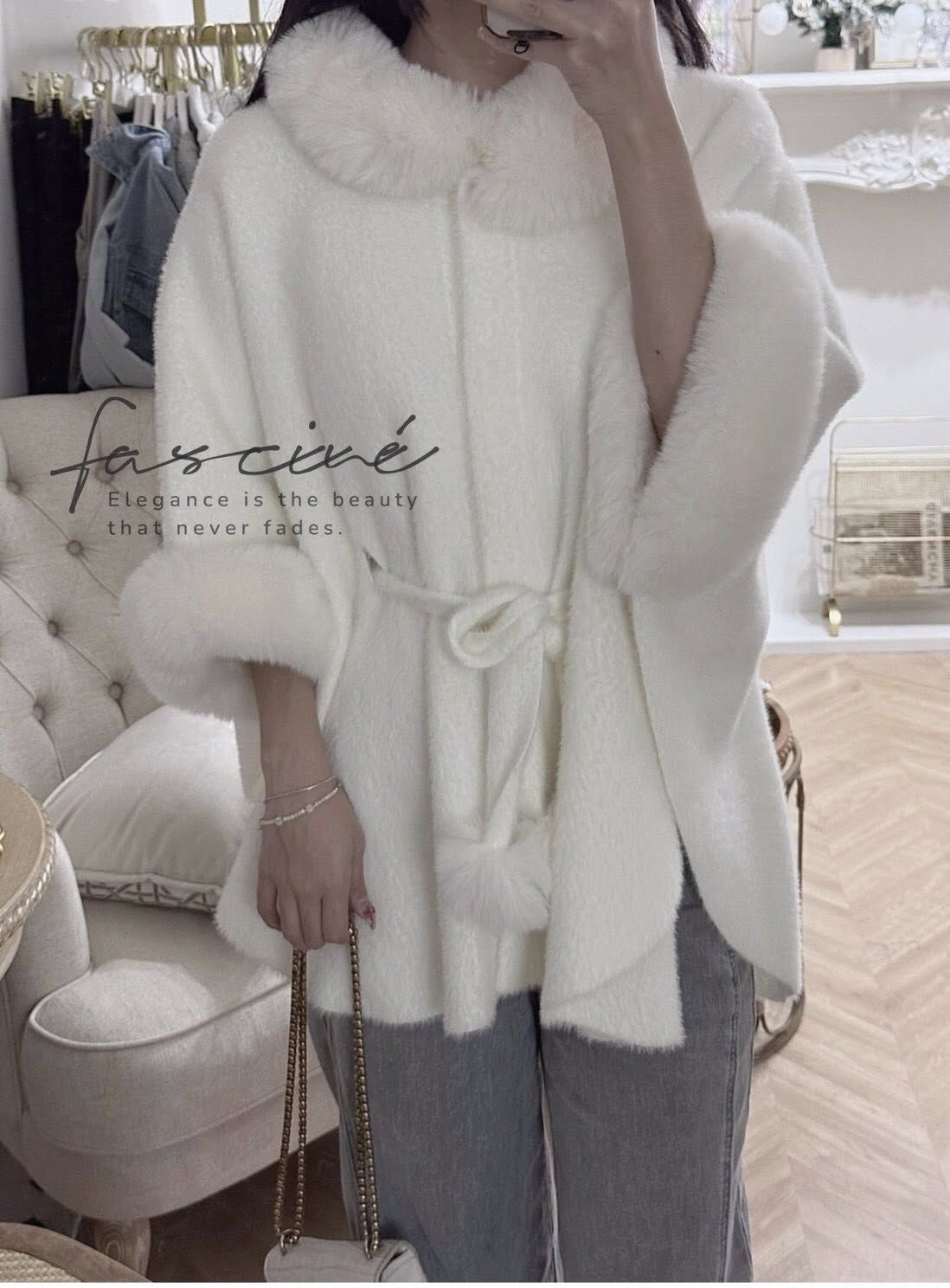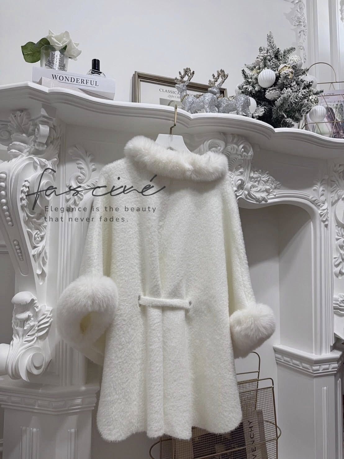 從領口到袖口一圈柔軟毛毛勾勒出精緻臉部線條,披肩式斗篷版型自然修飾肩背與腰腹,小個子也能穿出高級氣場。蓬鬆卻不臃腫的混紡面料,加上綁帶收腰與毛球細節,微微一繫就有法式名媛的溫柔浪漫,約會、年節聚會一件搞定。